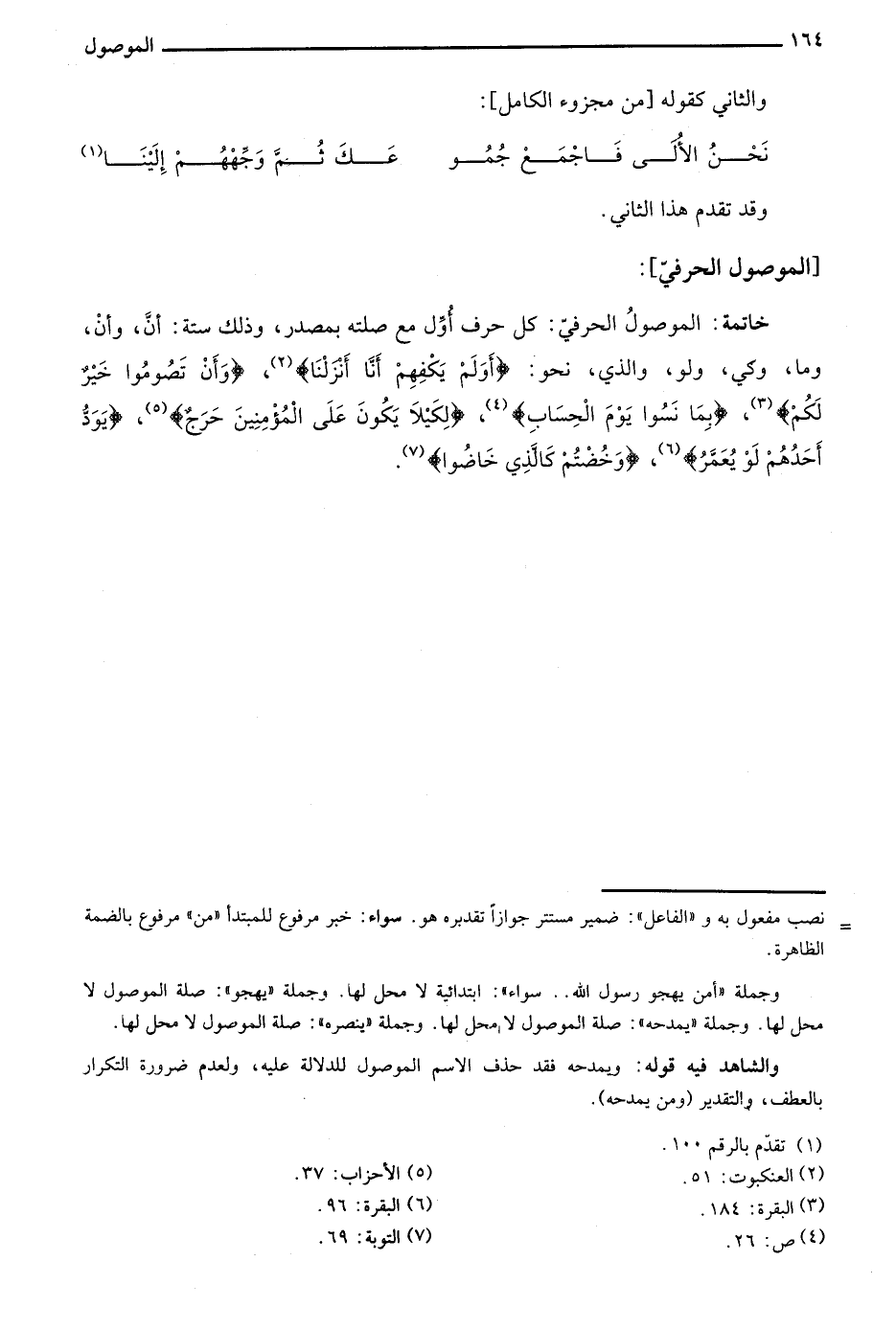 خاتمة: الموصول الحرفي: كل حرف أول مع صلته بمصدر، وذلك ستة: أن، وأن، وما، وكي، ولو، والذي، نحو: {أَوَلَمْ يَكْفِهِمْ أَنَّا أَنْزَلْنَا} 2، {وَأَنْ تَصُومُوا خَيْرٌ لَكُمْ} 3، {بِمَا نَسُوا يَوْمَ الْحِسَابِ} 4، {لِكَيْ لا يَكُونَ عَلَى الْمُؤْمِنِينَ حَرَجٌ} 5، {يَوَدُّ أَحَدُهُمْ لَوْ يُعَمَّرُ} 6، {وَخُضْتُمْ كَالَّذِي خَاضُوا} 7.