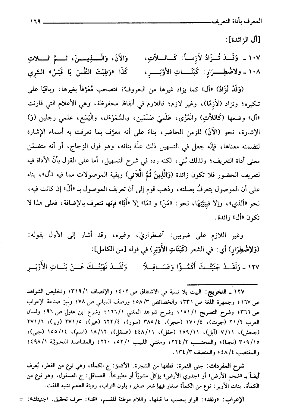 "وَقَدْ تُزادُ" "أل" كما يزاد غيرها من الحروف؛ فتصحب معرفا بغيرها، وباقيا على تنكيره؛ وتزاد "لاَزِما"، وغير لازم؛ فاللازم في ألفاظ محفوظة، وهي الأعلام التي قارنت "أل" وضعها "كَالَّلاتِ" والعزى، على صنمين، والسموءل، واليسع، علمي رجلين "وَ" الإشارة، نحو: "الآنَ" للزمن الحاضر، بناء على أنه معرف بما تعرفت به أسماء الإشارة لتضمنه معناها، فإنه جعل في التسهيل ذلك علة بنائه، وهو قول الزجاج، أو أنه متضمن معنى أداة التعريف؛ ولذلك بني، لكنه رده في شرح التسهيل، أما على القول بأن الأداة فيه لتعريف الحضور فلا تكون زائدة "وَالَّذِينَ ثُم اللاَّتِي" وبقية الموصولات مما فيه "أل"، بناء على أن الموصول يتعرف بصلته، وذهب قوم إلى أن تعريف الموصول بـ"أل" إن كانت فيه، نحو "الذي"، وإلا فبنيتها، نحو: "من" و"ما" إلا "أيا" فإنها تتعرف بالإضافة، فعلى هذا لا تكون "أل" زائدة.