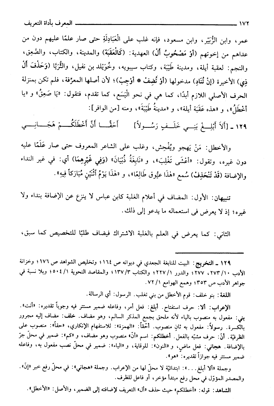 عمر، وابن الزبير، وابن مسعود، فإنه غلب على العبادلة حتى صار علما عليهم دون من عداهم من إخوتهم "أَوْ مَصْحُوبُ أَلْ" العهدية: "كَالْعَقَبَهْ" والمدينة، والكتاب، والصعق، والنجم: لعقبة أيلي، ومدينة طيبة، وكتاب سيبويه، وخويلد بن نفيل، والثريا "وَحَذْفَ أَلْ ذِي" الأخيرة "إِنْ تُنَادِ" مدخولها "أَوْ تُضَفْ أَوْجِبْ"؛ لأن أصلها المعرفة، فلم تكن بمنزلة الحرف الأصلي اللازم أبدا، كما هي في نحو اليسع، كما تقدم، فتقول: "يا صعق" و"يا أخطل"، و"هذه عقبة أيلي"، و"مدينة طيبة"، ومنه "من الوافر":