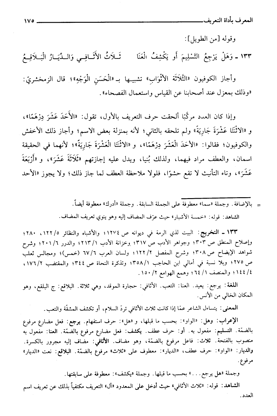 الشاهد: قوله: "ثلاث الأثافي" حيث أدخل على المعدود "أل" التعريف مكتفيا بذلك عن تعريف اسم العدد.