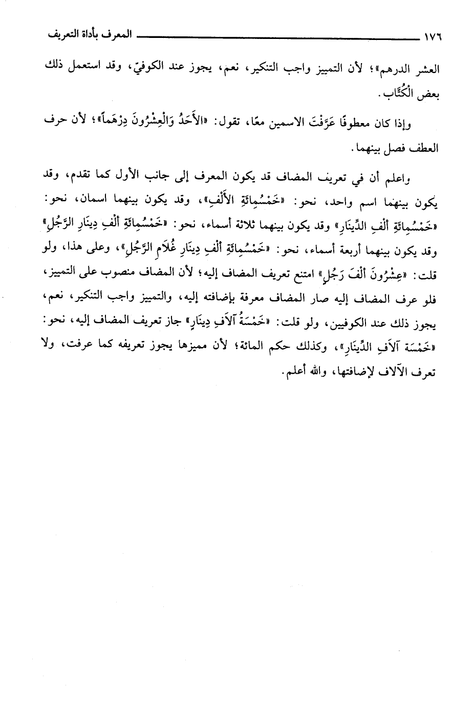 واعلم أن في تعريف المضاف قد يكون المعرف إلى جانب الأول كما تقدم، وقد يكون بينهما اسم واحد، نحو: "خمسمائة الألف"، وقد يكون بينهما اسمان، نحو: "خمسمائة ألف الدينار" وقد يكون بينهما ثلاثة أسماء، نحو: "خمسمائة ألف دينار الرجل" وقد يكون بينهما أربعة أسماء، نحو: "خمسمائة ألف دينار غلام الرجل"، وعلى هذا، لو قلت: "عشرون ألف رجل" امتنع تعريف المضاف إليه؛ لأن المضاف منصوب على التمييز، فلو عرف المضاف إليه صار المضاف معرفة بإضافته إليه، والتمييز واجب التنكير، نعم، يجوز ذلك عند الكوفيين، ولو قلت: "خمسة آلاف دينار" جاز تعريف المضاف إليه، نحو: "خمسة آلاف الدينار"، وكذلك حكم المائة؛ لأن مميزها يجوز تعريفه كما عرفت، ولا تعرف الآلاف لإضافتها، والله أعلم.