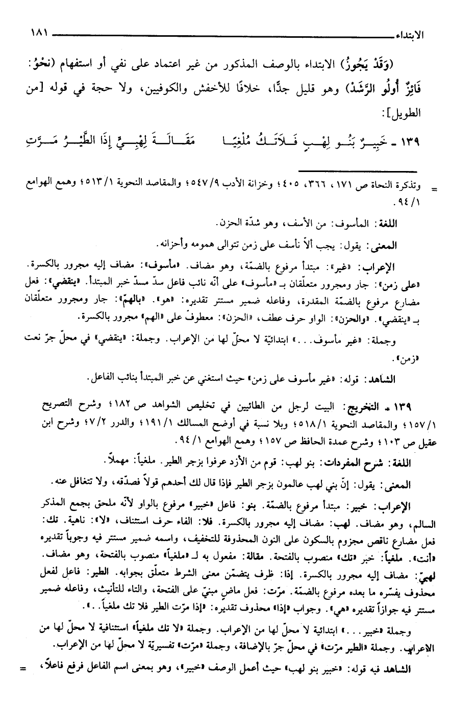 الإعراب: خبير: مبتدأ مرفوع بالضمة. بنو: فاعل "خبير" مرفوع بالواو لأنه ملحق بجمع المذكر السالم، وهو مضاف. لهب: مضاف إليه مجرور بالكسرة. فلا: الفاء حرف استئناف، "لا": ناهية. تك: فعل مضارع ناقص مجزوم بالسكون على النون المحذوفة للتخفيف، واسمه ضمير مستتر فيه وجوبا تقديره "أنت". ملغيا: خبر "تك" منصوب بالفتحة. مقالة: مفعول به لـ"ملغيا" منصوب بالفتحة، وهو مضاف. لهبي: مضاف إليه مجرور بالكسرة. إذا: ظرف يتضمن معنى الشرط متعلق بجوابه. الطير: فاعل لفعل محذوف يفسره ما بعده مرفوع بالضمة. مرت: فعل ماض مبني على الفتحة، والتاء للتأنيث، وفاعله ضمير مستتر فيه جوازا تقديره "هي". وجواب "إذا" محذوف تقديره: "إذا مرت الطير فلا تك ملغيا".