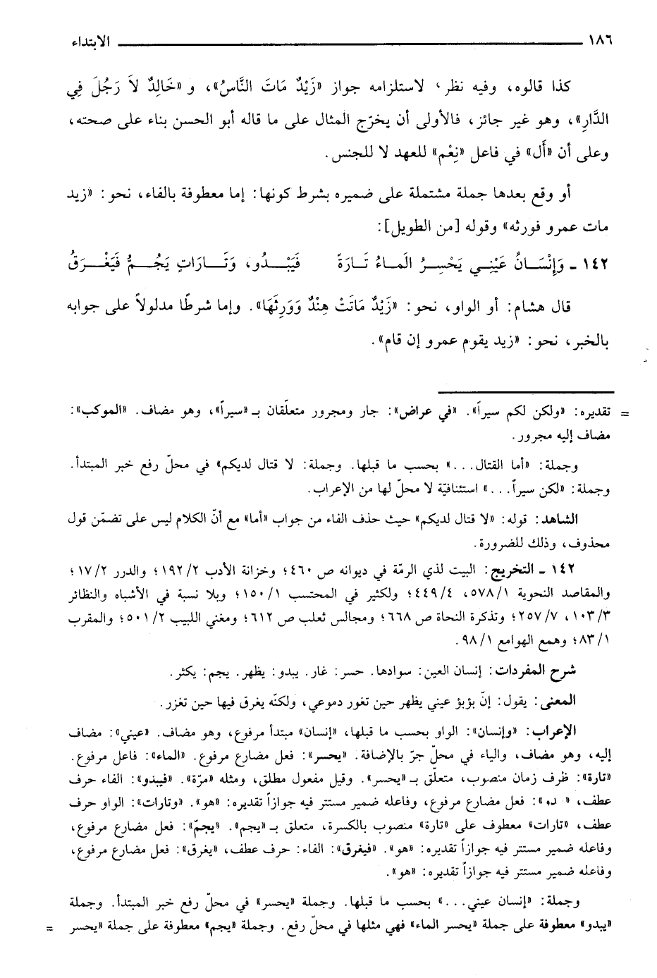 الشاهد: قوله: "وإنسان عيني يحسر الماء فيبدو" حيث عطف الجملة التي تصلح لأن تكون خبرا عن المبتدأ وهي "فتبدو"، لاشتمالها على ضمير يعود إلى المبتدأ "إنسان"، عطفها على جملة لا تصلح لأن تكون خبرا لخلوها من ذلك الضمير، وهي "يحسر الماء".