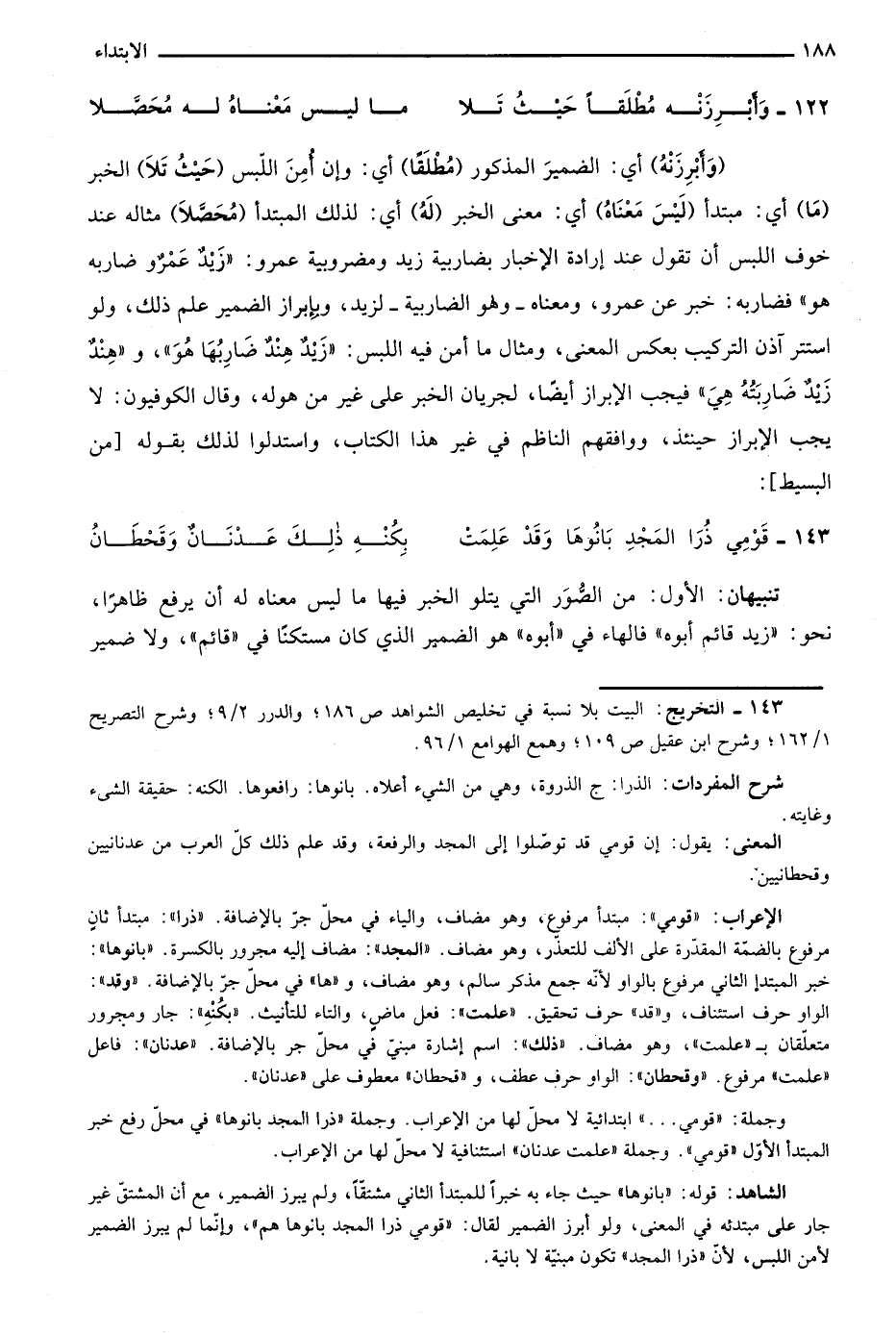 143- التخريج: البيت بلا نسبة في تخليص الشواهد ص186؛ والدرر 2/ 9؛ وشرح التصريح 1/ 162؛ وشرح ابن عقيل ص109؛ وهمع الهوامع 1/ 96.