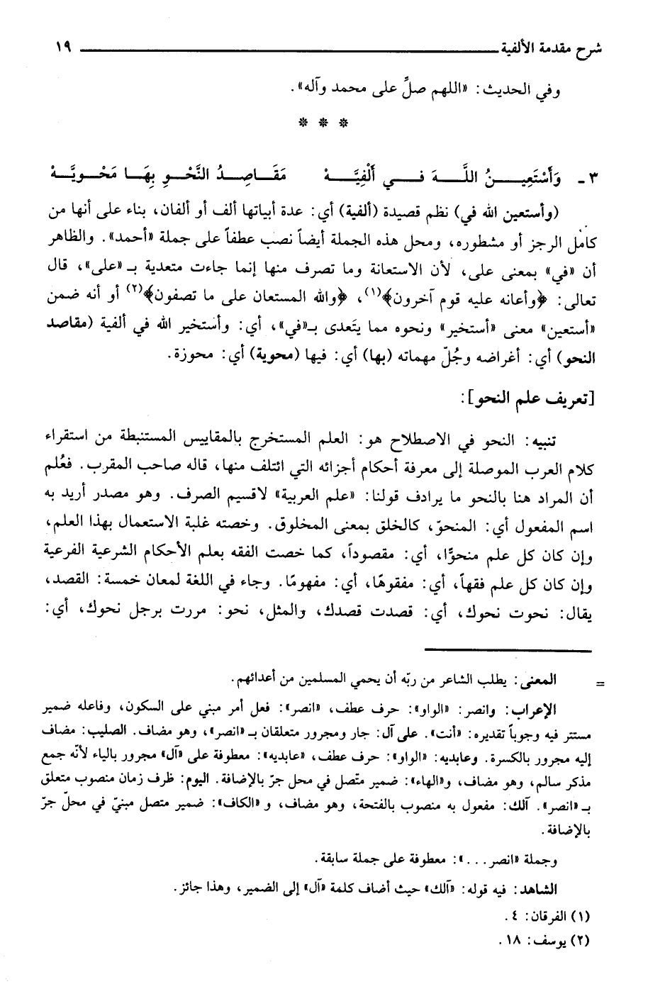 تنبيه: النحو في الاصطلاح هو: العلم لمستخرج بالمقاييس المستنبطة من استقراء كلام العرب الموصلة إلى معرفة أحكام أجزائه التي ائتلف منها، قاله صاحب المقرب. فعلم أن المراد هنا بالنحو ما يرادف قولنا: "علم العربية" لا قسيم الصرف. وهو مصدر أريد به اسم المفعول أي: المنحو، كالخلق بمعنى المخلوق. وخصته غلبة الاستعمال بهذا العلم، وإن كان كل علم منحوًا، أي: مقصودًا، كما خصت الفقه بعلم الأحكام الشرعية الفرعية وإن كان كل علم فقهًا، أي: مفقوهًا، أي: مفهومًا. وجاء في اللغة لمعان خمسة: القصد، يقال: نحوت نحوك، أي: قصدت قصدك، والمثل، نحو: مررت برجل نحوك، أي: