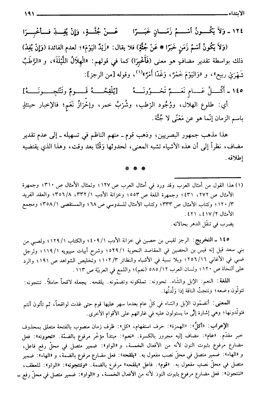 145- التخريج: الرجز لقيس بن حصين في خزانة الأدب 1/ 409؛ والكتاب 1/ 129؛ ولصبي من بني سعد قيل إنه قيس بن الحصين في المقاصد النحوية 1/ 529؛ وشرح أبيات سيبويه 1/ 119؛ ولرجل ضبي في الأغاني 16/ 256؛ وبلا نسبة في الأشباه والنظائر 3/ 102؛ وتخليص الشواهد ص191؛ والرد على النحاة ص120؛ ولسان العرب 12/ 585 "نعم"؛ واللمع في العربية ص113.