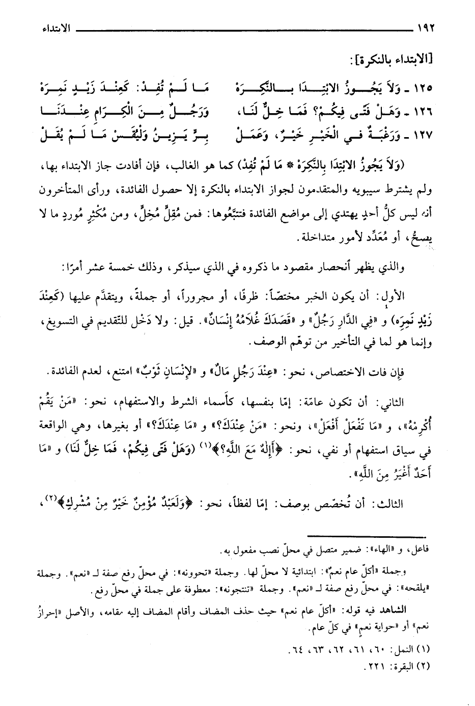 "وَلاَ يَجُوزُ الابْتِدَا بِالنَّكِرهْ مَا لَمْ تُفِدْ" كما هو الغالب، فإن أفادت جاز الابتداء بها، ولم يشترط سيبويه والمتقدمون لجواز الابتداء بالنكرة إلا حصول الفائدة، ورأى المتأخرون أنه ليس كل أحد يهتدي إلى مواضع الفائدة فتتبعوها: فمن مقلّ مخلّ، ومن مكثر مورد ما لا يصح، أو معدد لأمور متداخلة.