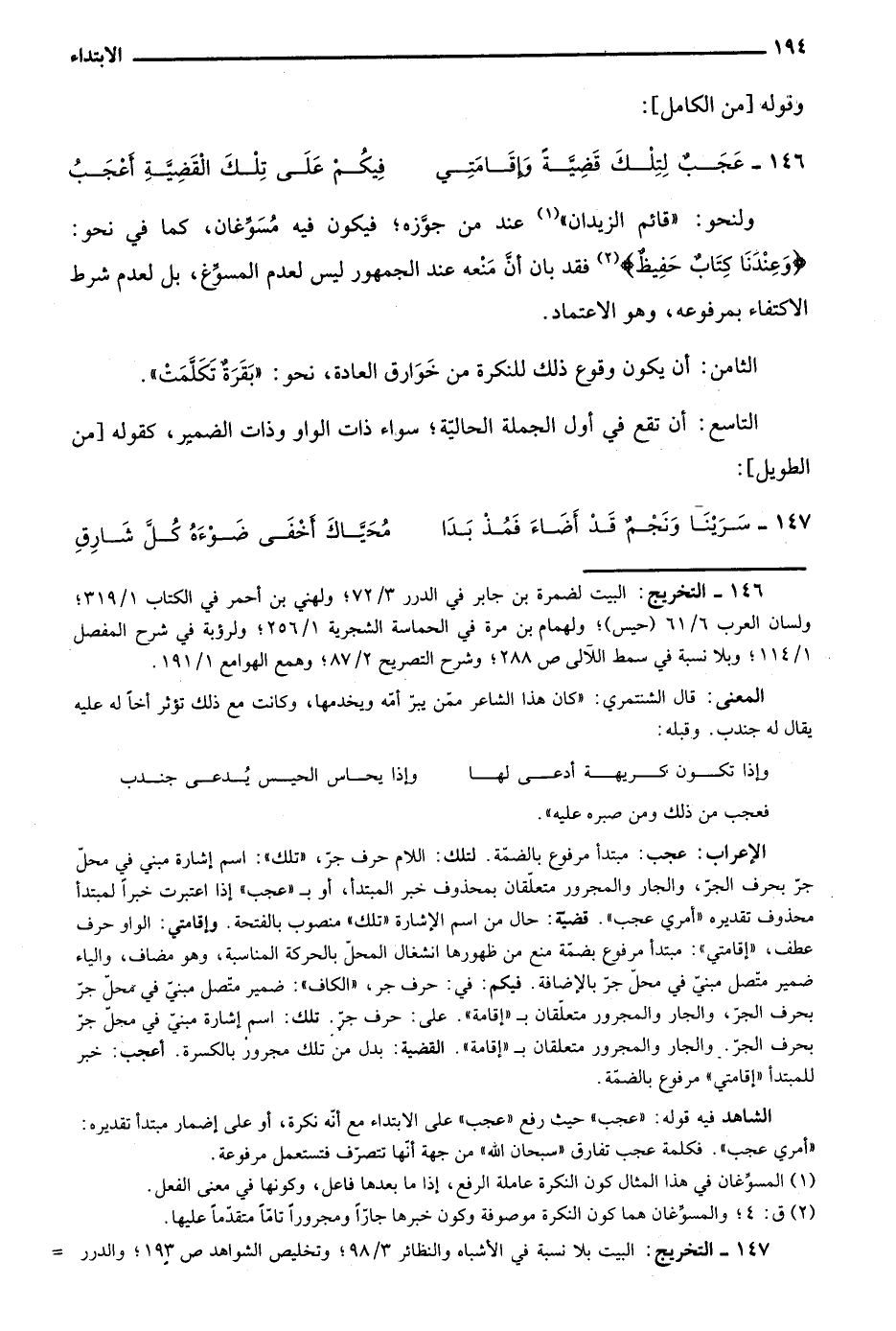الشاهد فيه قوله: "عجب" على الابتداء مع أنه نكرة، أو على إضمار مبتدأ تقديره: "أمري عجب". فكلمة عجب تفارق "سبحان الله" من جهة أنها تتصرف فتستعمل مرفوعة.