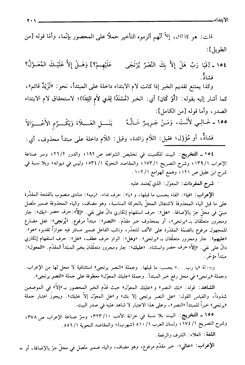 الشاهد: قوله: "بك النصر" و"عليك المعول" حيث قدم الخبر المحصور بـ"إلا" في الموضعين شذوذا، والقياس القول: "هل النصر يرتجى إلا بك" و"هل المعول إلا عليك". ويجوز اعتبار جملة "يرتجى" خبرا للمبتدأ "النصر"، وعلى هذا الاعتبار لا شاهد عليه في صدر البيت.