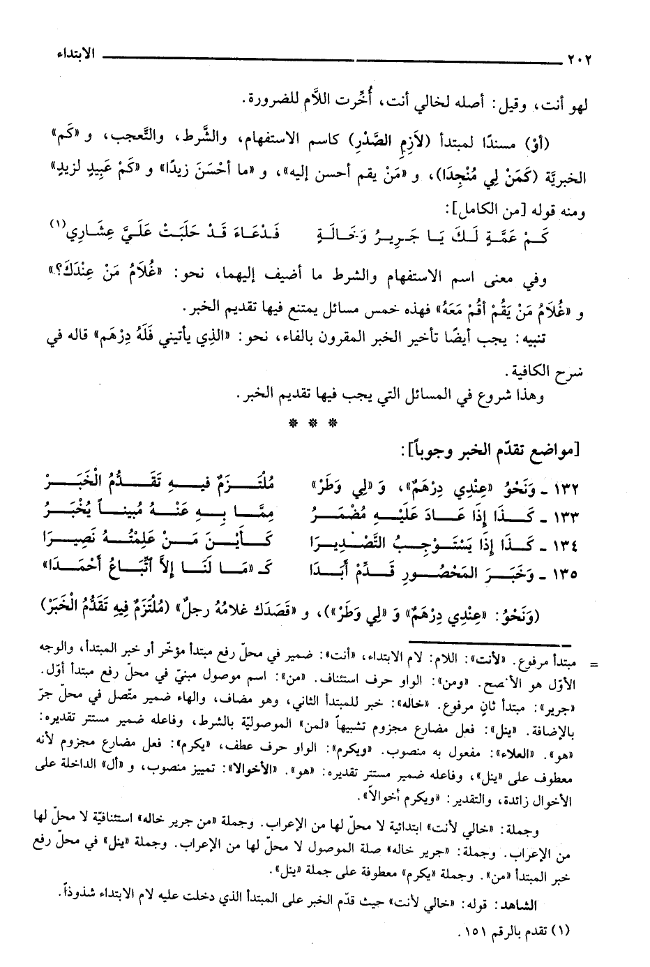 "أَو" مسندا لمبتدأ "لاَزِمِ الْصَّدر" كاسم الاستفهام، والشرط، والتعجب، و"كم" الخبرية "كَمَنْ لِي مُنْجِدَا"، و"من يقم أحسن إليه"، و"ما أحسن زيدا"، و"كم عبيد لزيد"، ومنه قوله "من الكامل":