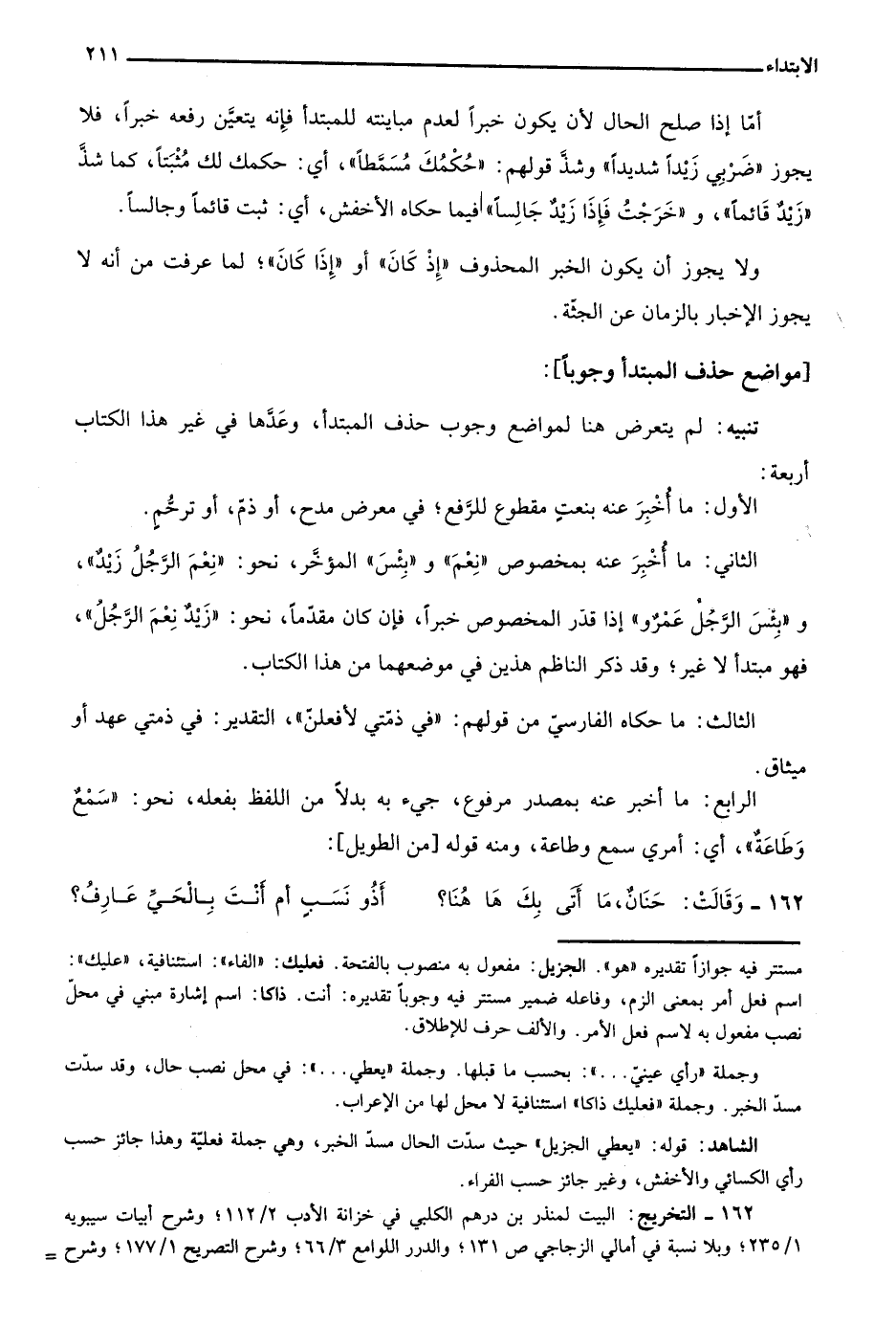 تنبيه: لم يتعرض هنا لمواضع وجوب حذف المبتدأ، وعدها في غير هذا الكتاب أربعة: