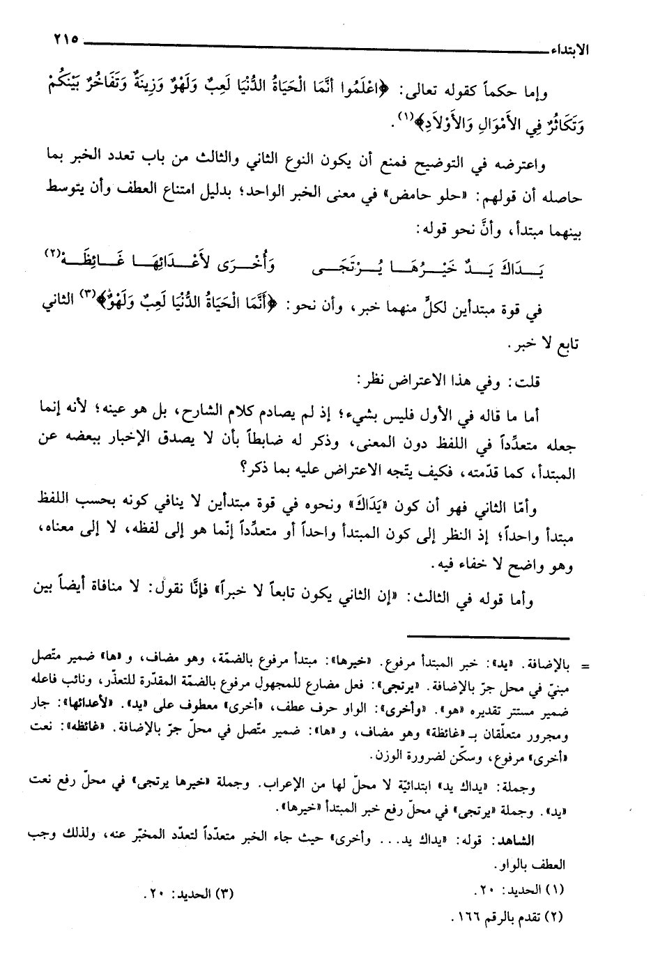 وأما الثاني فهو أن كون "يداك" ونحوه في قوة مبتدأين لا ينافي كونه بحسب اللفظ مبتدأ واحدا؛ إذ النظر إلى كون المبتدأ واحدا أو متعددا إنما هو إلى لفظه، لا إلى معناه، وهو واضح لا خفاء فيه.