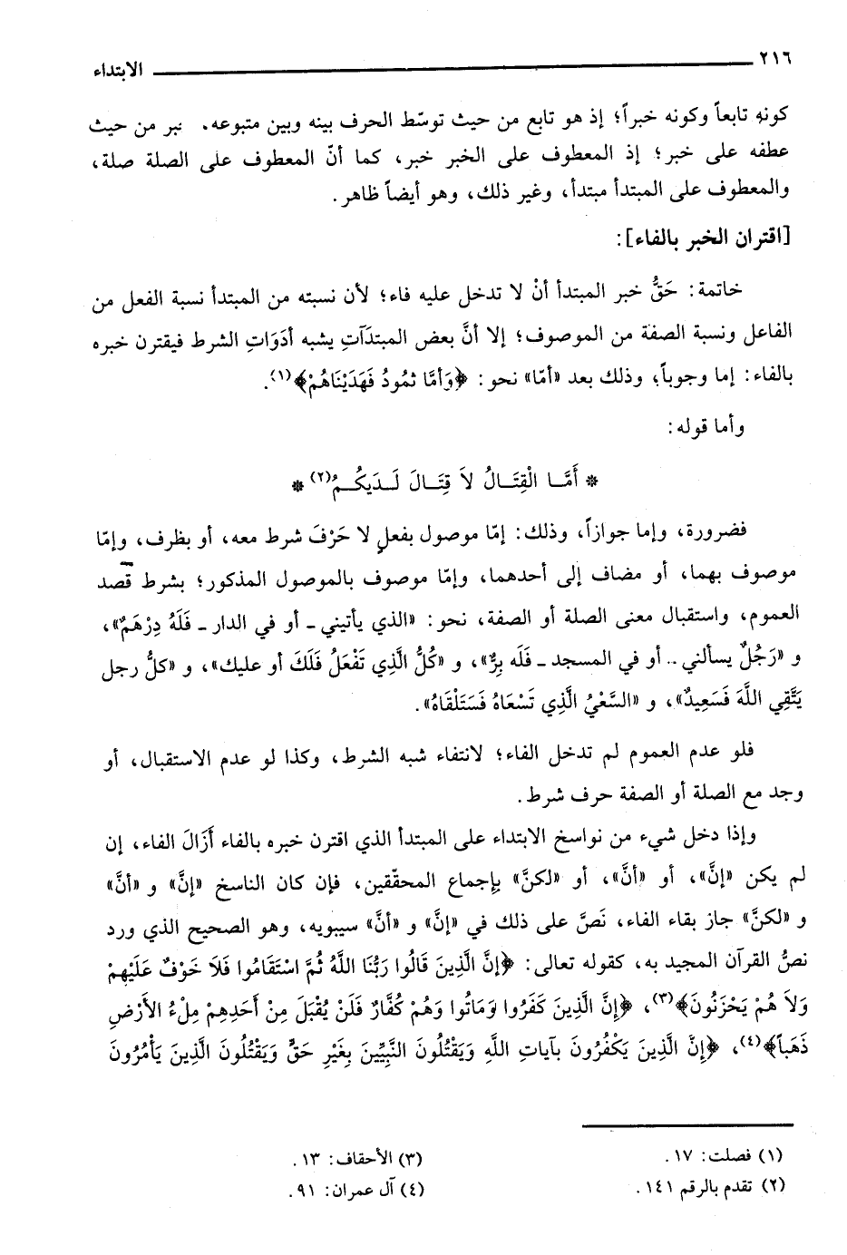 خاتمة: حق خبر المبتدأ أن لا تدخل عليه فاء؛ لأن نسبته من المبتدأ نسبة الفعل من الفاعل ونسبة الصفة من الموصوف؛ إلا أن بعض المبتدآت يشبه أدوات الشرط فيقترن خبره بالفاء: إما وجوبًا؛ وذلك بعد أما نحو: {وَأَمَّا ثَمُودُ فَهَدَيْنَاهُمْ} 1.