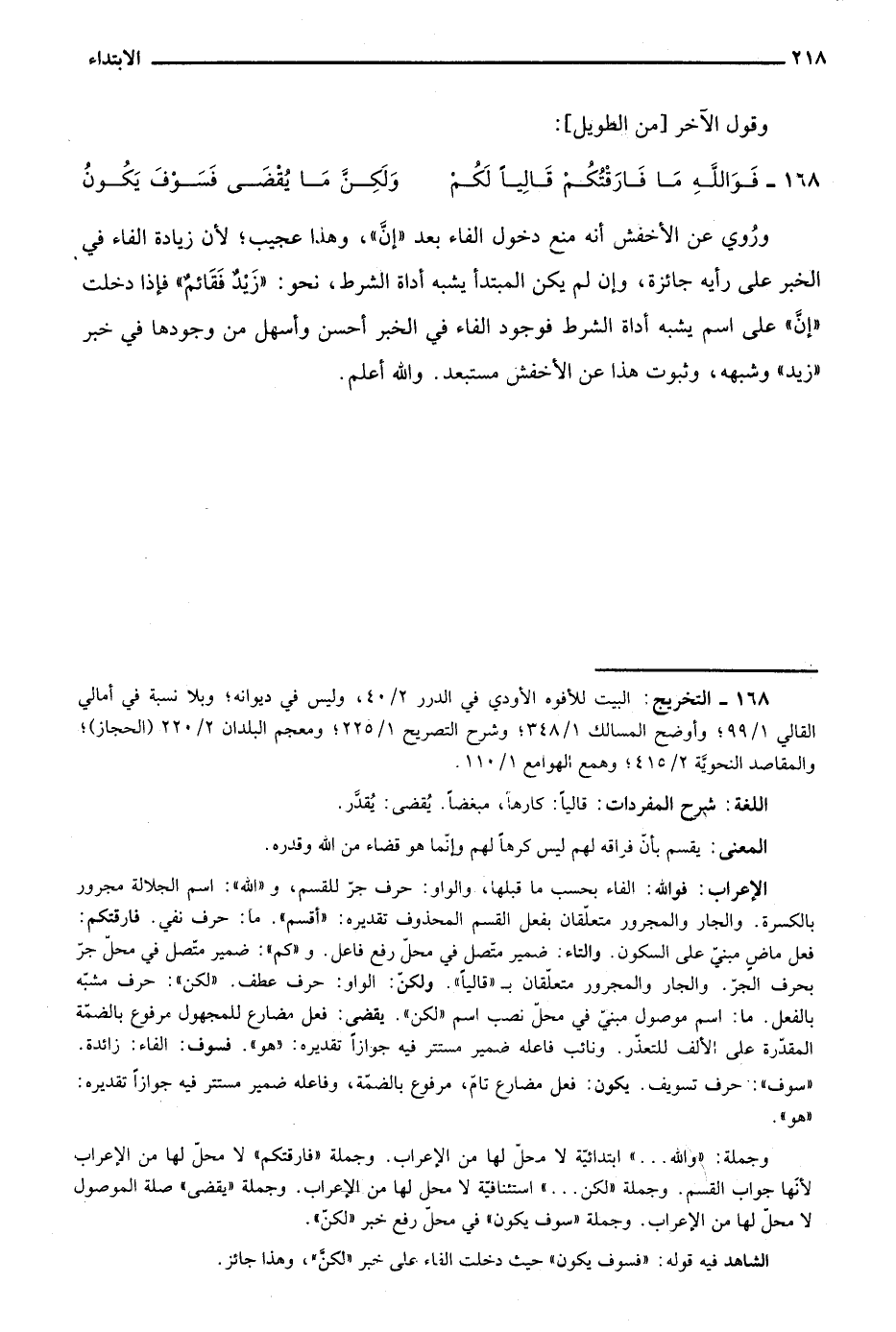 الإعراب: فوالله: الفاء حسب ما قبلها، والواو: حرف جر للقسم، و"الله": اسم الجلالة مجرور بالكسرة. والجار والمجرور متعلقان بفعل القسم المحذوف تقديره: "أقسم". ما: حرف نفي. فارقتكم: فعل ماض مبني على السكون. والتاء: ضمير متصل في محل رفع فاعل. و"كم": ضمير متصل في محل جر بحرف الجر. والجار والمجرور متعلقان بـ"قاليا". ولكن: الواو: حرف عطف. "لكن": حرف مشبه بالفعل. ما: اسم موصول مبني في محل نصب اسم "لكن". يقضى: فعل مضارع للمجهول مرفوع بالضمة المقدرة على الألف للتعذر. ونائب فاعله ضمير مستتر فيه جوازا تقديره: "هو". فسوف: الفاء: زائدة. "سوف": حرف تسويف. يكون: فعل مضارع تام، مرفوع بالضمة، وفاعله ضمير مستتر فيه جوازا تقديره: "هو".