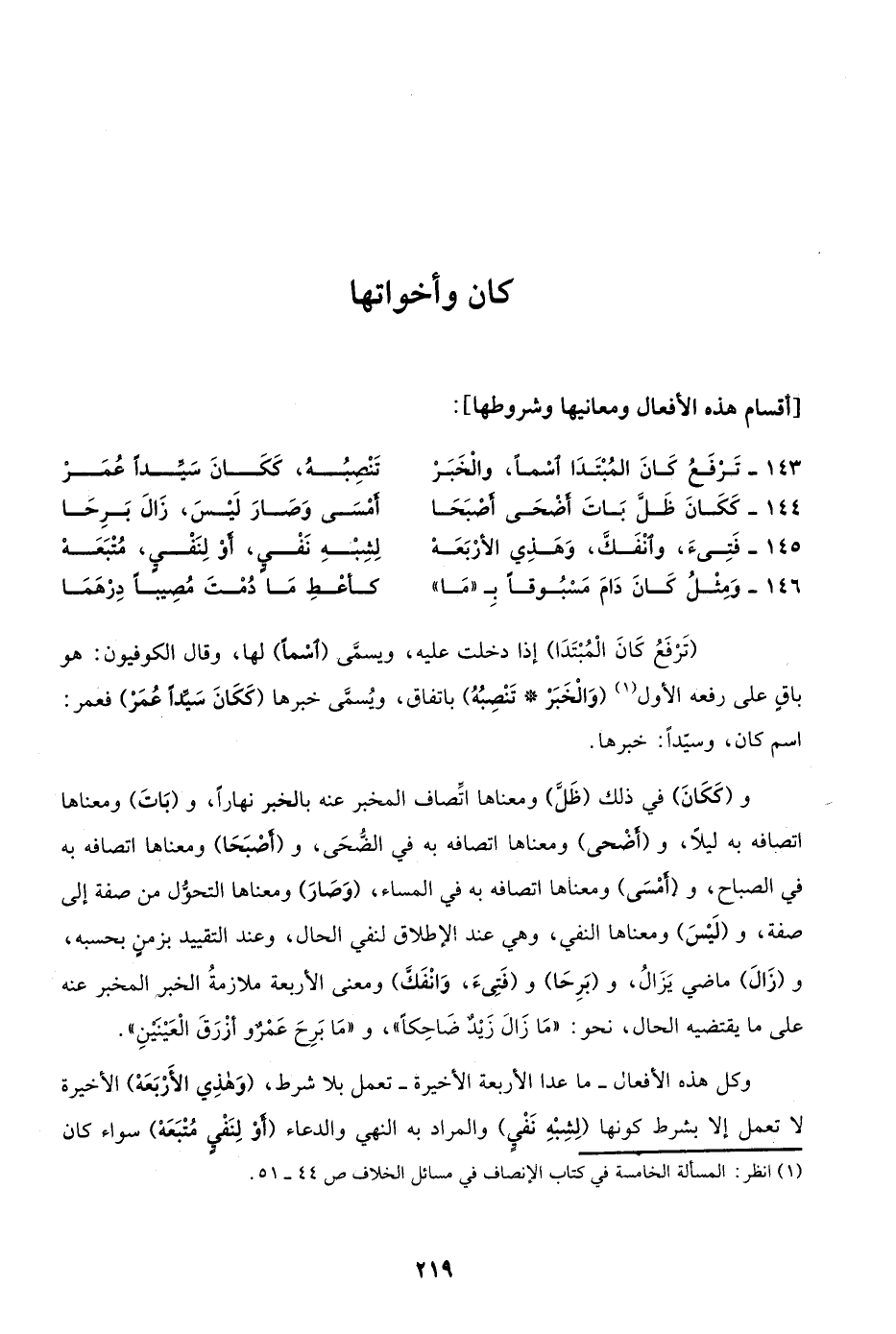 و"كَكَانَ" في ذلك "ظَلَّ" ومعناها اتصاف المخبر عنه بالخبر نهارا، "وبَاتَ" ومعناها اتصافه به ليلا، و"أَضْحَى" ومعناها اتصافه به في الضحى، و"أَصْبَحا" ومعناها اتصافه به في الصباح، و"أَمْسَى" ومعناها اتصافه به في المساء، "وَصَارَ" ومعناها التحول من صفة إلى صفة، "وَلَيْسَ" ومعناها النفي، وهي عند الإطلاق لنفي الحال، وعند التقييد بزمن بحسبه، "زَالَ" ماضي يزال، و"بَرِحَا" و"فَتِىءِ وَانْفَكَّ" ومعنى الأربعة ملازمة المخبر عنه على ما يقتضيه الحال، نحو: "ما زال زيد ضاحكا"، و"ما برح عمرو أزرق العينين".