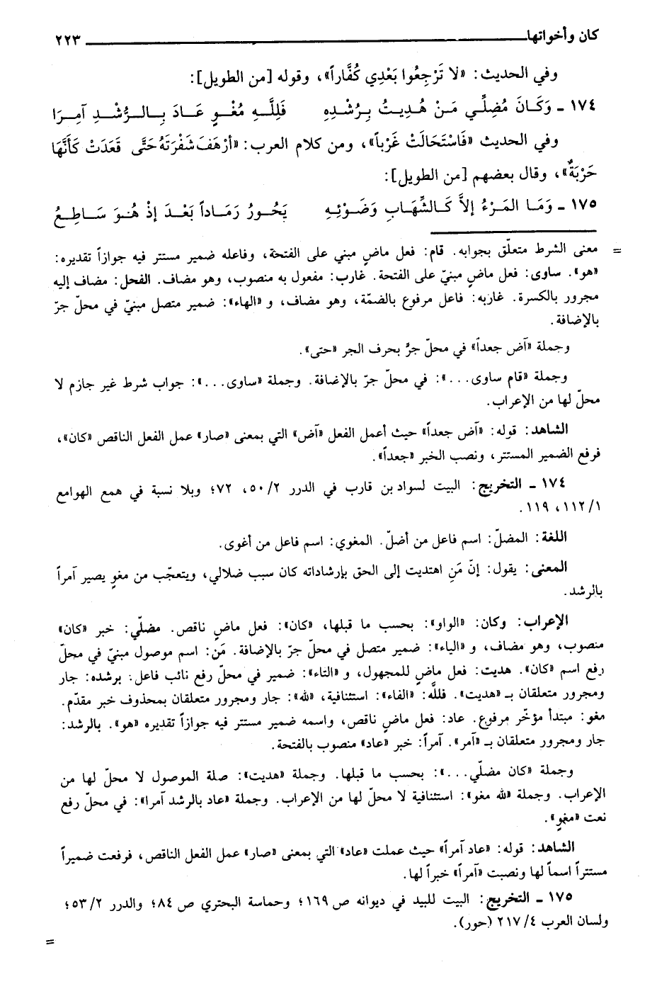 الإعراب: وكان: "الواو": بحسب ما قبلها، "كان": فعل ماض ناقص. مضلي: خبر "كان" منصوب، وهو مضاف، و"الياء": ضمير متصل في محل جر بالإضافة. من: اسم موصول مبني في محل رفع اسم "كان". هديت: فعل ماض للمجهول، و"التاء": ضمير في محل رفع نائب فاعل. برشده: جار ومجرور متعلقان بـ"هديت". فلله: "الفاء": استئنافية، "لله" جار ومجرور متعلقان بمحذوف خبر مقدم. مغو: مبتدأ مؤخر مرفوع. عاد: فعل ماض ناقص، واسمه ضمير مستتر فيه جوازا تقديره "هو". بالرشد: جار ومجرور متعلقان بـ"آمر". آمرا: خبر "عاد" منصوب بالفتحة.