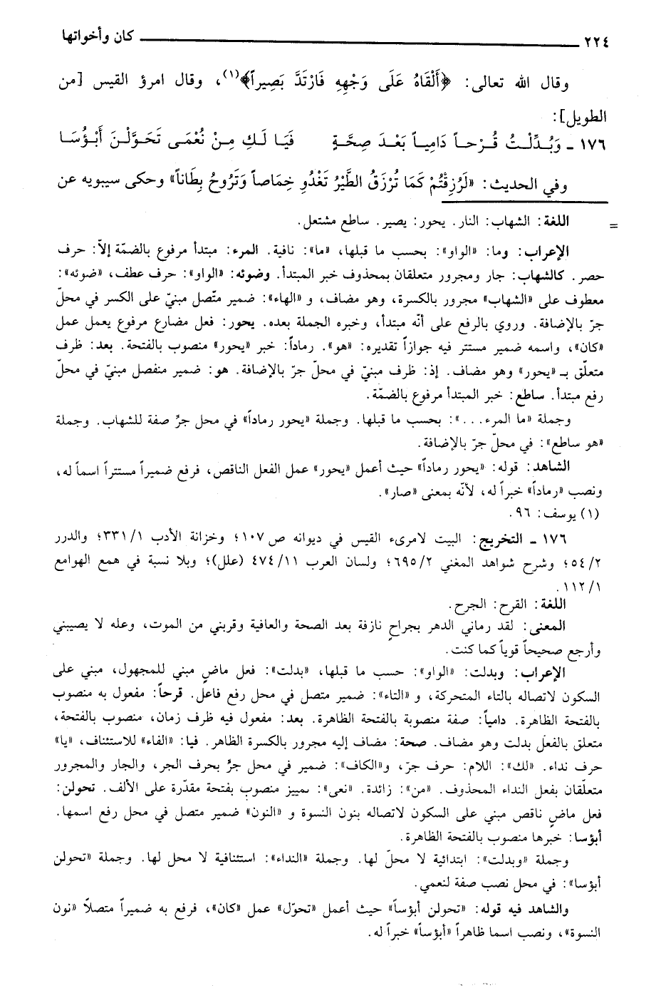 الإعراب: وبدلت: "الواو": حسب ما قبلها، "بدلت": فعل ماض مبني للمجهول، مبني على السكون لاتصاله بالتاء المتحركة، و"التاء": ضمير متصل في محل رفع فاعل. قرحا: مفعول به منصوب بالفتحة الظاهرة. داميا: صفة منصوبة بالفتحة الظاهرة. بعد: مفعول فيه ظرف زمان، منصوب بالفتحة، متعلق بالفعل بدلت وهو مضاف. صحة: مضاف إليه مجرور بالكسرة الظاهرة. فيا: "الفاء" للاستئناف، "يا" حرف نداء. "لك": اللام: حرف جر، و"الكاف": ضمير في محل جر بحرف الجر، والجار والمجرور متعلقان بفعل النداء المحذوف. "من": زائدة. "نعى": تمييز منصوب بفتحة مقدرة على الألف. تحولن: فعل ماض ناقص مبني على السكون لاتصاله بنون النسوة و"النون" ضمير متصل في محل رفع اسمها أبؤسا: خبرها منصوب بالفتحة الظاهرة.