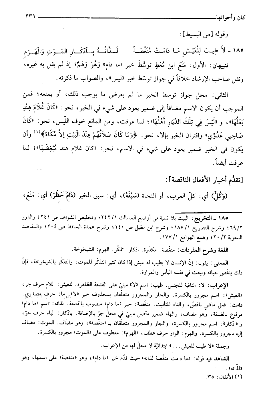 185- التخريج: البيت بلا نسبة في أوضح المسالك 1/ 242؛ وتخليص الشواهد ص241؛ والدرر 2/ 69؛ وشرح التصريح 1/ 187؛ وشرح ابن عقيل ص140؛ وشرح عمدة الحافظ ص204؛ والمقاصد النحوية 2/ 20؛ وهمع الهوامع 1/ 177.