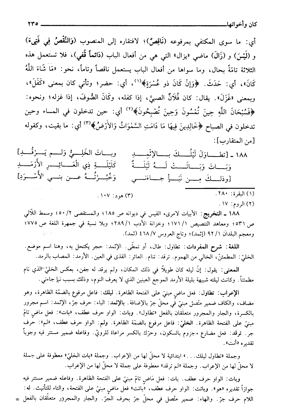 أي: ما سوى المكتفي بمرفوعه "نَاقِصٌ"؛ لافتقاره إلى المنصوب "وَالنَّقْصُ فِي فَتِىءَ" و"لَيْسَ" و"زَالَ" ماضي "يزال" التي هي من أفعال الباب "دَائِما قُفِي"، فلا تستعمل هذه الثلاثة تامة بحال، وما سواها من أفعال الباب يستعمل ناقصا وتاما، نحو: "ما شاء الله كان" أي: حدث. {وَإِنْ كَانَ ذُو عُسْرَةٍ} 1، أي: حضر؛ وتأتي كان بمعنى "كفل"، وبمعنى "غزل". يقال: كان فلان الصبي، إذا كفله، وكان الصوف، إذا غزله؛ ونحو: {فَسُبْحَانَ اللَّهِ حِينَ تُمْسُونَ وَحِينَ تُصْبِحُونَ} 2 أي: حين تدخلون في المساء وحين تدخلون في الصباح {خَالِدِينَ فِيهَا مَا دَامَتِ السَّمَاوَاتُ وَالْأَرْضُ} 3 أي: ما بقيت، وكقوله "من المتقارب":
