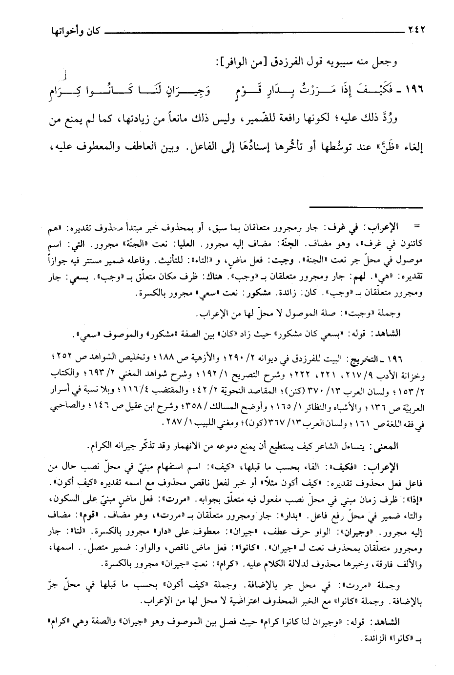 الإعراب: "فكيف": الفاء بحسب ما قبلها، "كيف": اسم استفهام مبني في محل نصب حال من فاعل فعل محذوف تقديره: "كيف أكون مثلا" أو خبر لفعل ناقص محذوف مع اسمه تقديره "كيف أكون". "إذا": ظرف زمان مبني في محل نصب مفعول فيه متعلق بجوابه. "مررت": فعل ماض مبني على السكون، والتاء ضمير في محل رفع فاعل. "بدار": جار ومجرور متعلقان بـ"مررت"، وهو مضاف. "قوم": مضاف إليه مجرور. "وجيران": الواو حرف عطف، "جيران": معطوف على "دار" مجرور بالكسرة. "لنا": جار ومجرور متعلقان بمحذوف نعت لـ"جيران". "كانوا": فعل ماض ناقص، والواو: ضمير متصل ... اسمها، والألف فارقة، وخبرها محذوف لدلالة الكلام عليه. "كرام": نعت "جيران" مجرور بالكسرة.