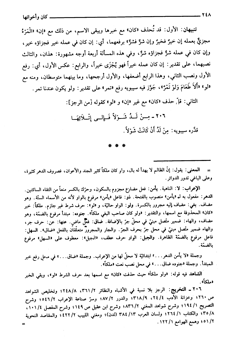تنبيهان: الأول: قد تحذف "كان" مع خبرها ويبقى الاسم، من ذلك مع "أن" المرء مجزي بعمله إن خير فخير وإن شر فشر" برفعهما، أي: إن كان في عمله خير فجزاؤه خير، وإن كان في عمله شر جزاؤه شر، وفي هذه المسألة أربعة أوجه مشهورة: هذان، والثالث نصبهما، على تقدير: إن كان عمله خيرا فهو يجزى خيرا، والرابع: عكس الأول، أي: رفع الأول ونصب الثاني، وهذا الرابع أضعفها، والأول أرجحها، وما بينهما متوسطان، ومنه مع "لو" "ألا طعام ولو تمر"، جوز فيه رفع "تمر" على تقدير: ولو يكون عندنا تمر.