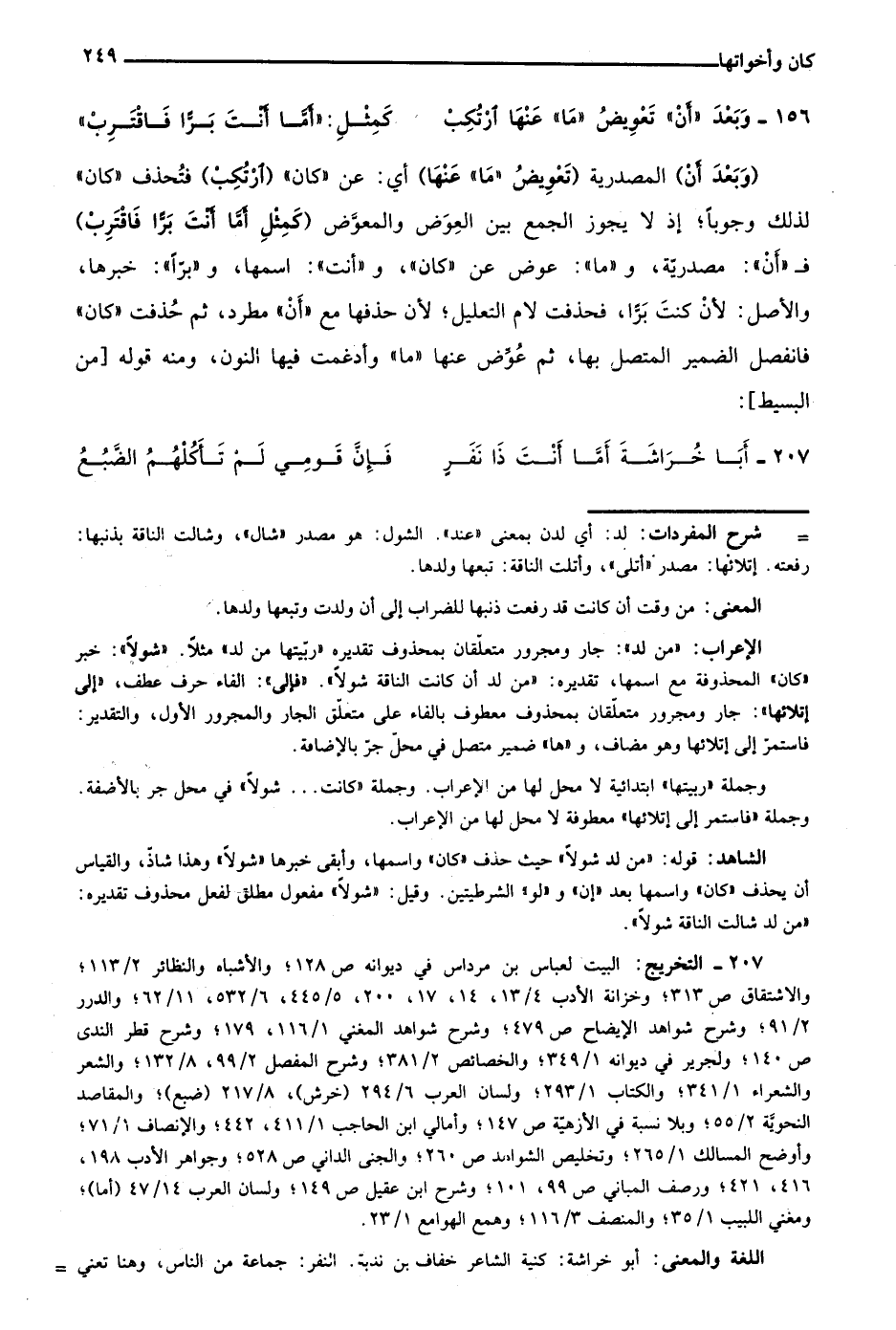 207- التخريج: البيت لعباس بن مرداس في ديوانه ص128؛ والأشباه والنظائر 2/ 113؛ والاشتقاق ص313؛ وخزانة الأدب 4/ 13، 14، 17، 200، 5/ 445، 6/ 532، 11/ 62؛ والدرر 2/ 91؛ وشرح شواهد الإيضاح ص479؛ وشرح شواهد المغني 1/ 116، 179؛ وشرح قطر الندى ص140؛ ولجرير في ديوانه 1/ 349؛ والخصائص 2/ 381؛ وشرح المفصل 2/ 99، 8/ 132؛ والشعر والشعراء 1/ 341؛ والكتاب 1/ 293؛ ولسان العرب 6/ 294 "خرش"، 8/ 217 "ضبع"؛ والمقاصد النحوية 2/ 55؛ وبلا نسبة في الأزهية ص147؛ وأمالي ابن الحاجب 1/ 411، 442؛ والإنصاف 1/ 71؛ وأوضح المسالك 1/ 265؛ وتخليص الشواهد ص260؛ والجنى الداني ص528؛ وجواهر الأدب 198، 416، 421؛ ورصف المباني ص99، 100؛ وشرح ابن عقيل ص 149؛ ولسان العرب 14/ 47 "أما"، ومغني اللبيب 1/ 35؛ والمنصف 3/ 116؛ وهمع الهوامع 1/ 23.