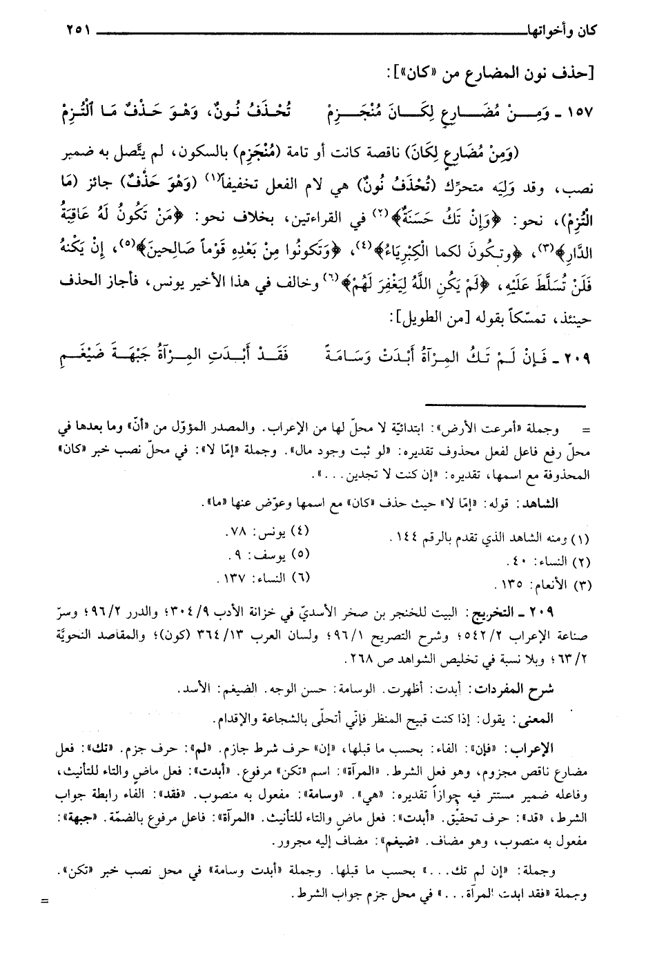 "وَمِنْ مُضَارِعٍ لَكَانَ" ناقصة كانت أو تامة "مُنْجَزِم" بالسكون، لم يتصل به ضمير نصب، وقد وليه متحرك "تُحْذَفُ نُونٌ" هي لام الفعل تخفيفاً1 "وَهْوَ حَذْفٌ" جائز "مَا الْتُزِمْ" نحو: {وَإِنْ تَكُ حَسَنَةً} 2 في القراءتين بخلاف نحو: {مَنْ تَكُونُ لَهُ عَاقِبَةُ الدَّارِ} 3، {وَتَكُونَ لَكُمَا الْكِبْرِيَاءُ} 4، {وَتَكُونُوا مِنْ بَعْدِهِ قَوْمًا صَالِحِينَ} 5، إن يكنه فلن تسلط عليه، {لَمْ يَكُنِ اللَّهُ لِيَغْفِرَ لَهُمْ} 6 وخالف في هذا أخيرا يونس، فأجاز الحذف حينئذٍ تمسكا بقوله "من الطويل":
