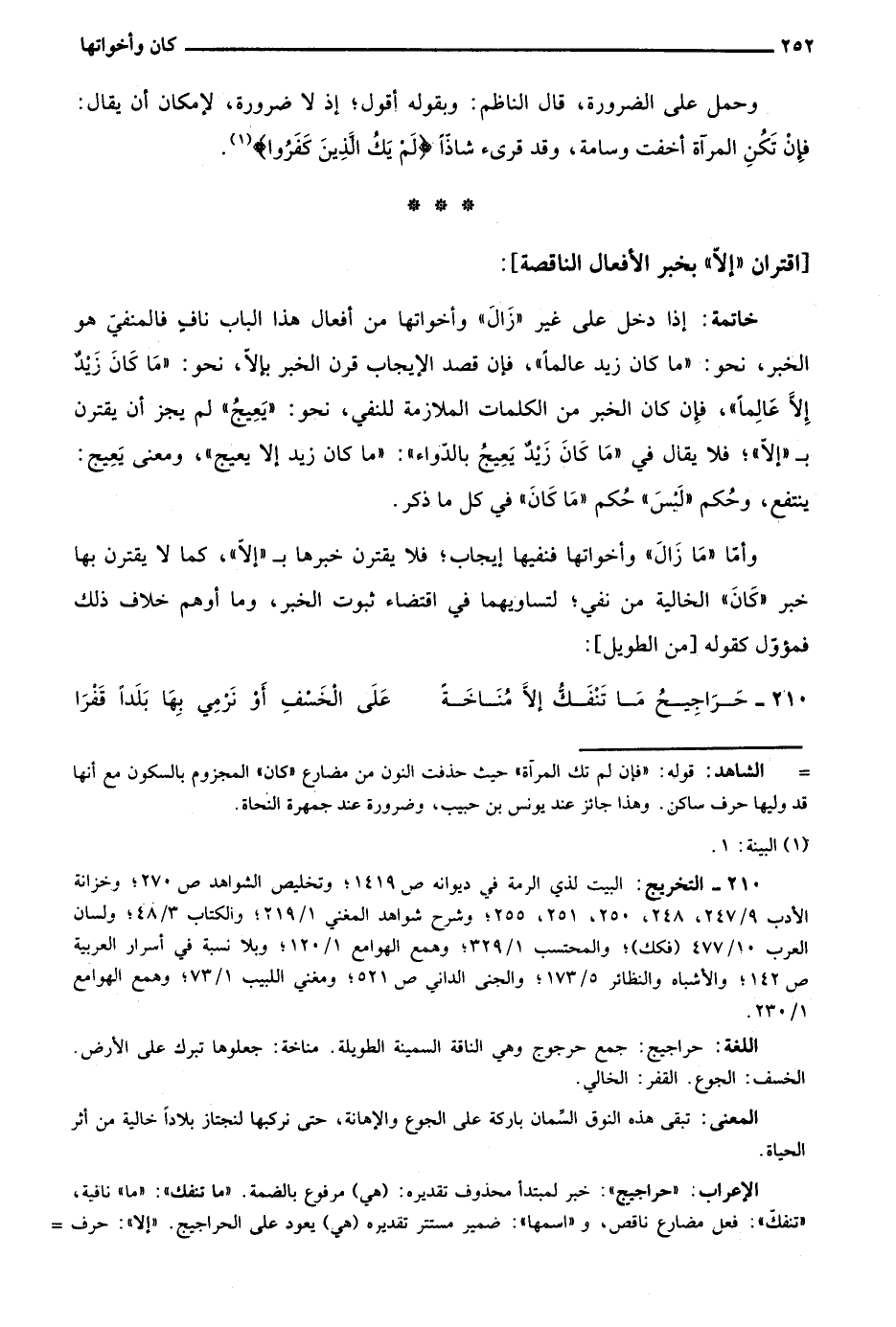 خاتمة: إذا دخل على غير "زال" وأخواتها من أفعال هذا الباب ناف فالمنفي هو الخبر، نحو: "ما كان زيد عالما"، فإن قصد الإيجاب قرن الخبر بإلا، نحو: "ما كان زيد إلا عالما"، فإن كان الخبر من الكلمات الملازمة للنفي، نحو: "يعيج" لم يجز أن يقترن بـ"إلا"؛ فلا يقال في "ما كان زيد يعيج بالدواء": "ما كان زيدا إلا يعيج"، ومعنى يعيج: ينتفع، وحكم "ليس" حكم "ما كان" في كل ما ذكر.
