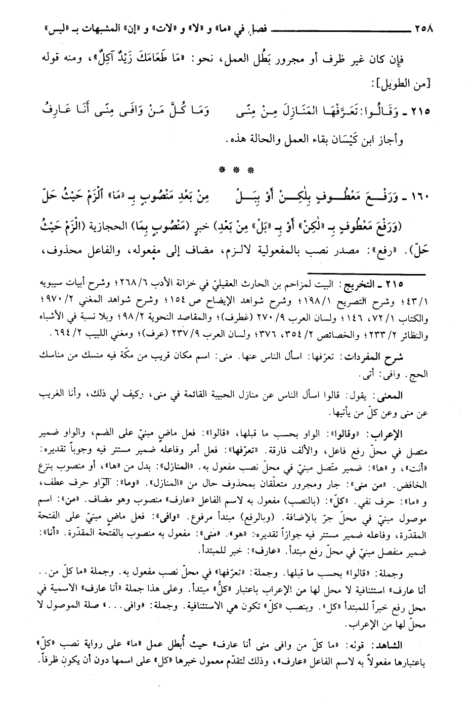 الإعراب: "وقالوا": الواو بحسب ما قبلها، "قالوا": فعل ماض مبني على الضم، والواو ضمير متصل في محل رفع فاعل، والألف فارقة. "تعرفها": فعل أمر وفاعله ضمير مستتر فيه وجوبا تقديره: "أنت"، و"ها": ضمير متصل مبني في محل نصب مفعول به. "المنازل": بدل من "ها"، أو منصوب بنزع الخافض. "من منى": جار ومجرور متعلقان بمحذوف حال من "المنازل". "وما": الواو حرف عطف، و"ما": حرف نفي. "كل": "بالنصب" مفعول به لاسم الفاعل "عارف" منصوب وهو مضاف. "من": اسم موصول مبني في محل جر بالإضافة. "وبالرفع" مبتدأ مرفوع. "وافى": فعل ماض مبني على الفتحة المقدرة، وفاعله ضمير مستتر فيه جوازا تقديره: "هو". "منى": مفعول به منصوب بالفتحة المقدرة. "أنا": ضمير منفصل مبني في محل رفع مبتدأ. "عارف": خبر للمبتدأ.