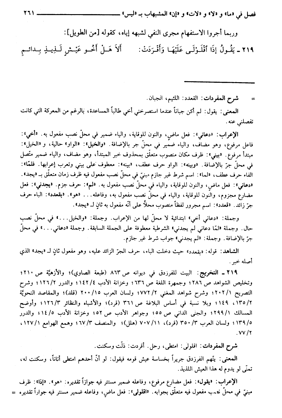 219- التخريج: البيت للفرزدق في ديوانه ص863 "طبعة الصاوي"؛ والأزهية ص210؛ وتخليص الشواهد ص286؛ وجمهرة اللغة ص636؛ وخزانة الأدب 4/ 142؛ والدرر 2/ 126؛ وشرح التصريح 10/ 202؛ وشرح شواهد المغني 2/ 772؛ ولسان العرب 15/ 200 "قلد"؛ والمقاصد النحوية 2/ 135، 149؛ وبلا نسبة في أساس البلاغة ص361 "قرد"؛ والأشباه والنظائر 3/ 126؛ وأوضح المسالك 1/ 299؛ والجنى الداني ص55؛ وجواهر الأدب ص52؛ وخزانة الأدب 5/ 14؛ والدرر 5/ 139؛ ولسان العرب 3/ 350 "قرد"، 11/ 707 "هلل"؛ والمنصف 3/ 67؛ وهمع الهوامع 1/ 127، 2/ 77.