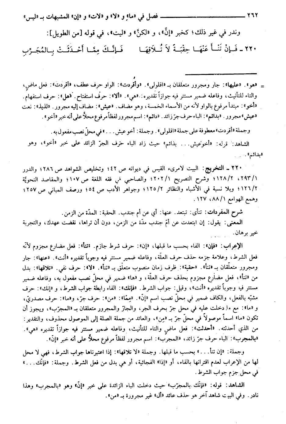 220- التخريج: البيت لامرئ القيس في ديوانه ص42؛ وتخليص الشواهد ص286؛ والدرر 1/ 293، 2/ 128؛ وشرح التصريح 1/ 202؛ والصاحبي في فقه اللغة ص107؛ والمقاصد النحوية 2/ 126؛ وبلا نسبة في الأشباه والنظائر 2/ 125؛ وجواهر الأدب ص54؛ ورصف المباني ص257؛ وهمع الهوامع 1/ 88، 127.