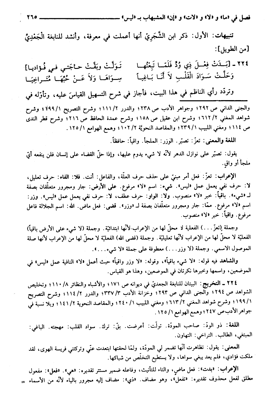 224- التخريج: البيتان للنابغة الجعدي في ديوانه ص171؛ والأشباه والنظائر 8/ 110؛ وتخليص الشواهد ص294؛ والجنى الداني ص293؛ وخزانة الأدب 3/ 337؛ والدرر 2/ 114؛ وشرح التصريح 1/ 199؛ وشرح شواهد المغني 2/ 613؛ ومغني اللبيب 1/ 240؛ والمقاصد النحوية 2/ 141؛ وبلا نسبة في جواهر الأدب ص247؛ وهمع الهوامع 1/ 125.