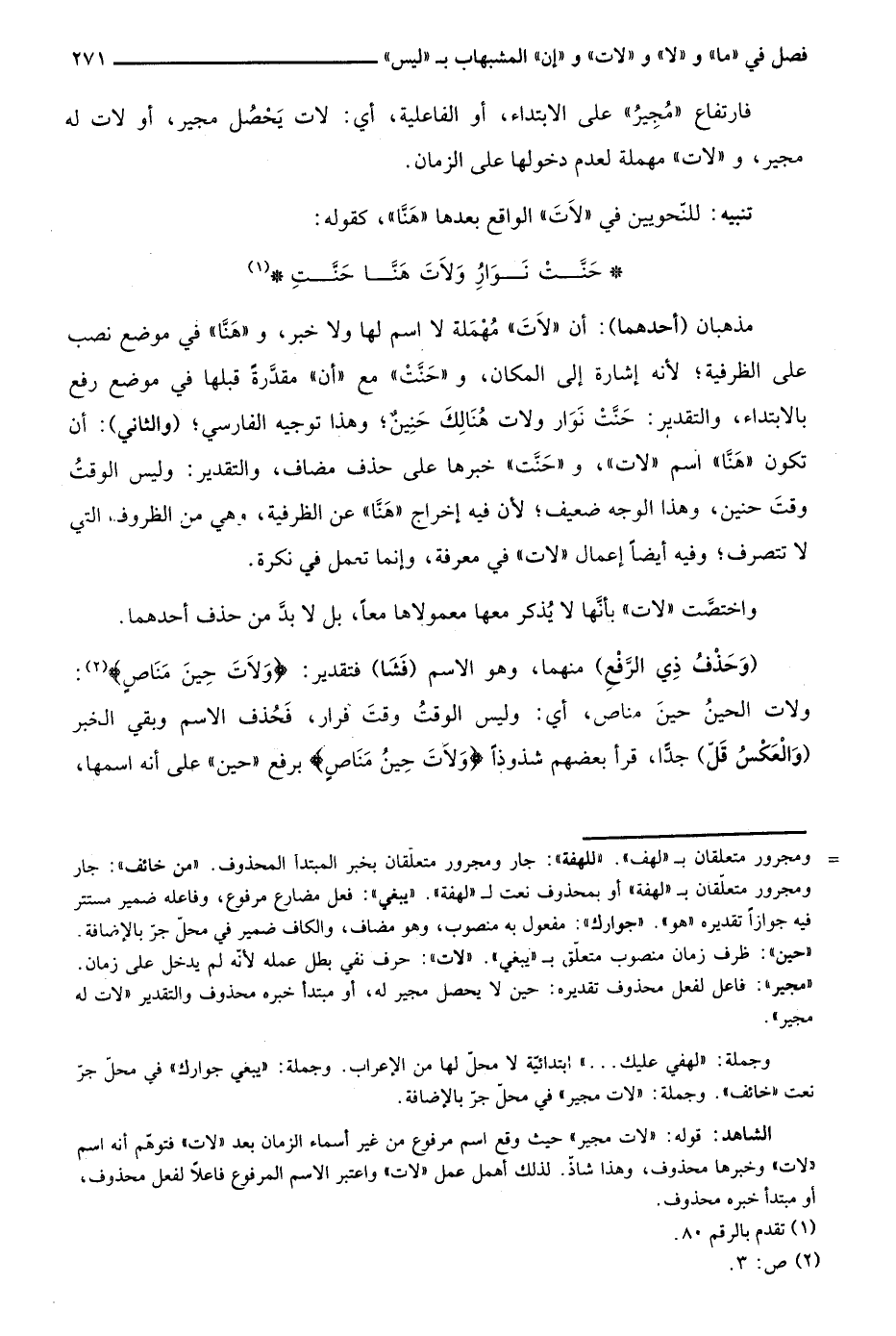 "وَحَذْفُ ذِي الْرَّفْعِ" منهما، وهو الاسم "فَشَا" فتقدير: {وَلاتَ حِينَ مَنَاصٍ} 2: ولات الحين حين مناص، أي: وليس الوقت وقت فرار، فحذف الاسم وبقي الخبر "وَالْعَكْسُ قلْ" جدا قرأ بعضهم شذوذا {وَلاتَ حِينَ مَنَاصٍ} برفع "حين" على أنه اسمها،