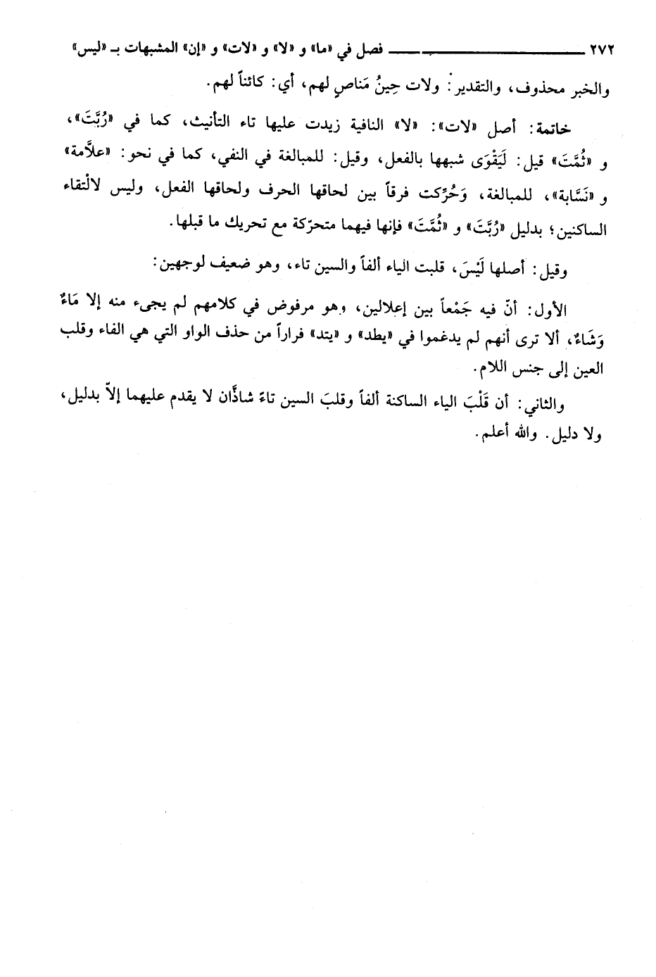 خاتمة: أصل "لات": "لا" النافية زيدت عليها تاء التأنيث، كما في "ربت" و"ثمت" قيل: ليقوى شبهها بالفعل، وقيل: للمبالغة في النفي، كما في نحو: "علامة" و"نسابة"، للمبالغة، وحركت فرقا بين لحاقها الحرف ولحاقها الفعل، وليس لالتقاء الساكنين؛ بدليل "ربت" و"ثمت" فإنها فيهما متحركة مع تحريك ما قبلها.