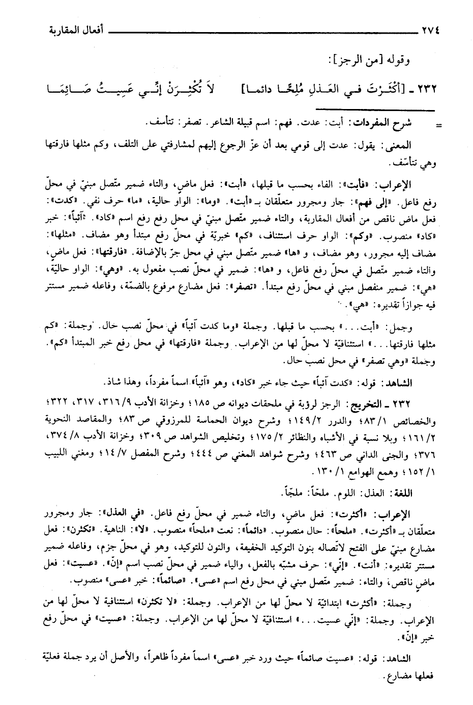 الإعراب: "أكثرت": فعل ماض، والتاء ضمير في محل رفع فاعل. "في العذل": جار ومجرور متعلقان بـ"أكثرت". "ملحا": حال منصوب. "دائما": نعت "ملحا" منصوب. "لا": الناهية. "تكثرن": فعل مضارع مبني على الفتح لاتصاله بنون التوكيد الخفيفة، والنون للتوكيد، وهو في محل جزم، وفاعله ضمير مستتر تقديره: "أنت". "إني": حرف مشبه بالفعل، والياء ضمير في محل نصب اسم "إن". "عسيت": فعل ماض ناقص، والتاء: ضمير متصل مبني في محل رفع اسم "عسى". "صائما": خبر "عسى" منصوب.