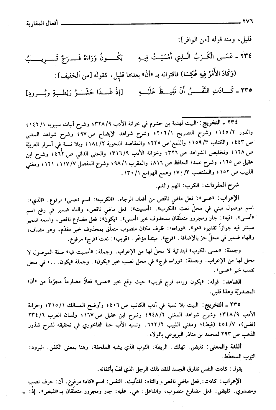235- التخريج: البيت بلا نسبة في أدب الكاتب ص406؛ وأوضح المسالك 1/ 315؛ وخزانة الأدب 9/ 348؛ وشرح شواهد المغني 2/ 948؛ وشرح ابن عقيل ص167؛ ولسان العرب 6/ 234 "نفس"، 7/ 454 "فيظ"؛ ومغني اللبيب 2/ 662. ونسبه الأب حنا الفاخوري في تحقيقه لشرح شذور الذهب ص293 لمحمد بن مناذر اليربوعي بالولاء.