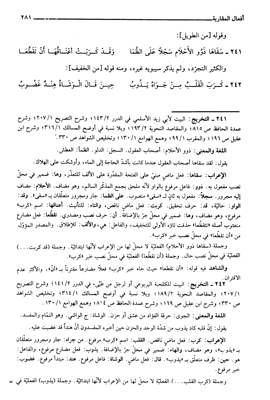 242- التخريج: البيت للكلحبة اليربوعي أو لرجل من طيئ في الدرر 2/ 141؛ وشرح التصريح 1/ 207؛ والمقاصد النحوية 2/ 189؛ وبلا نسبة في أوضح المسالك 1/ 314؛ وتخليص الشواهد ص330؛ وشرح ابن عقيل ص169؛ وشرح عمدة الحافظ ص814؛ وهمع الهوامع 1/ 130.