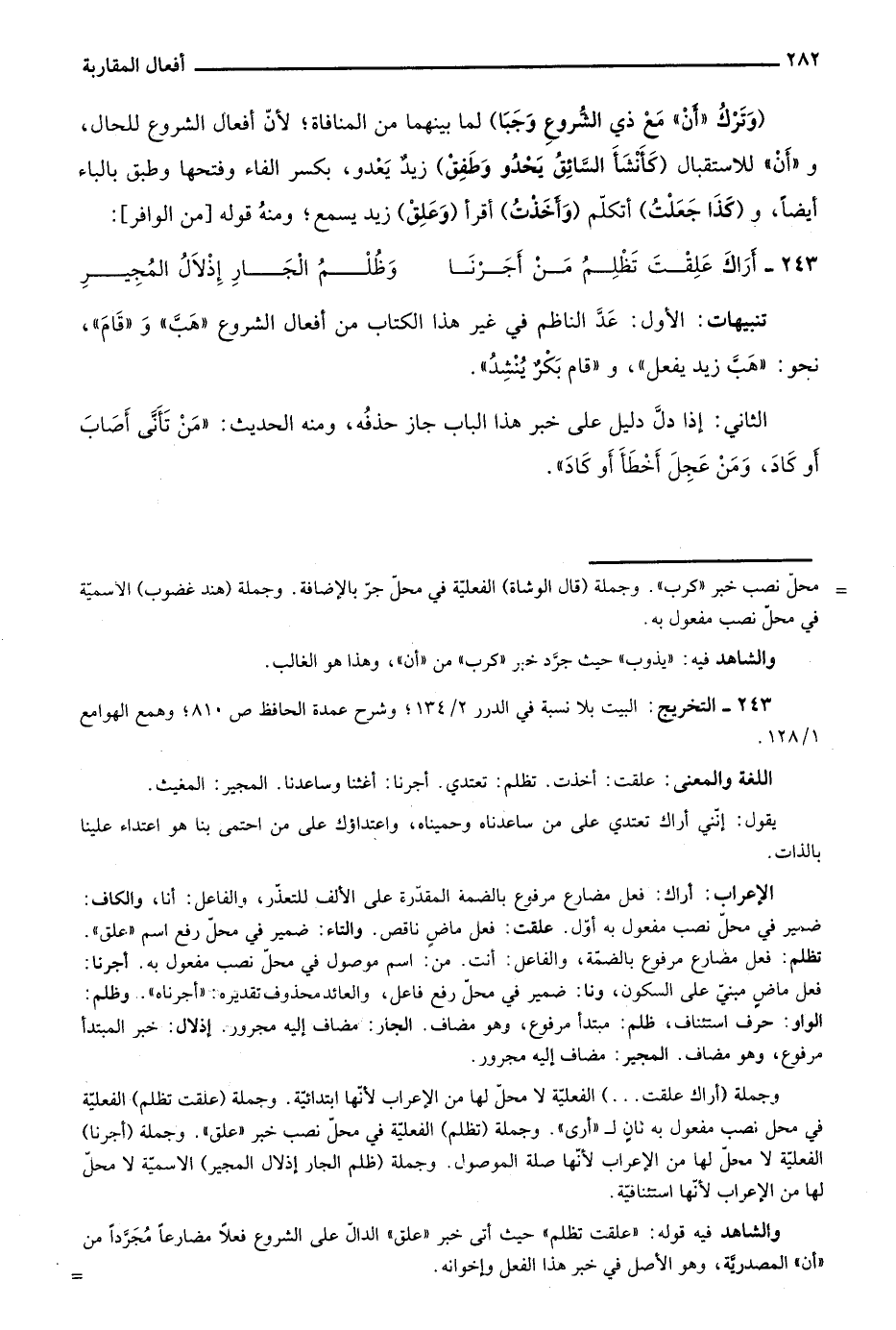 تنبيهات: الأول: عد الناظم في غير هذا الكتاب من أفعال الشروع "هب" و"قام"، نحو: "هب زيد يفعل"، و"قام بكر ينشد".