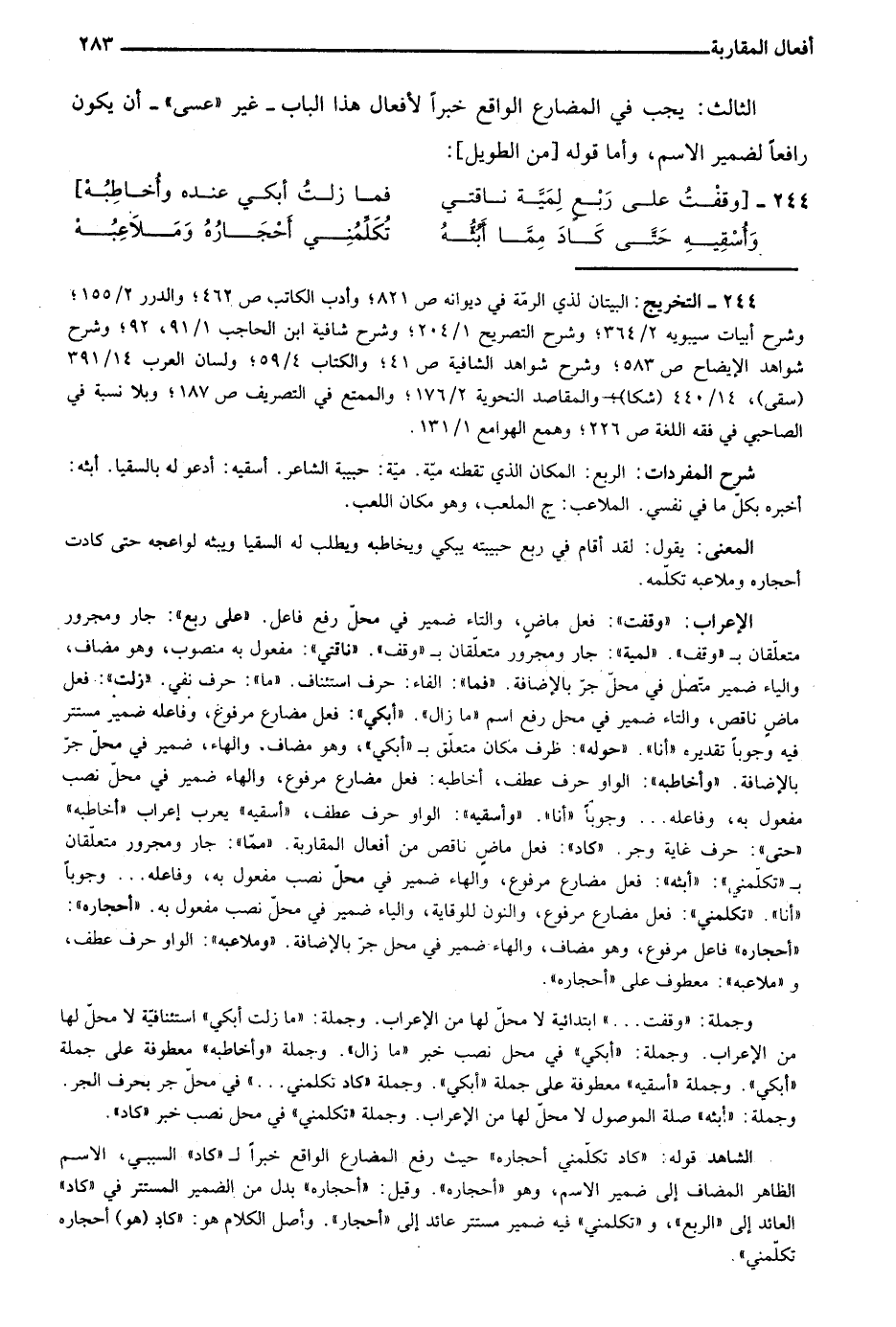 الشاهد قوله: "كاد تكلمني أحجاره" حيث رفع المضارع الواقع خبرا لـ"كاد" السببي، الاسم الظاهر المضاف إلى ضمير الاسم، وهو "أحجاره". وقيل: "أحجاره" بدل من الضمير المستتر في "كاد" العائد إلى "الربع"، و"تكلمني" فيه ضمير مستتر عائد إلى "أحجار". وأصل الكلام هو: "كاد "هو" أحجاره تكلمني".