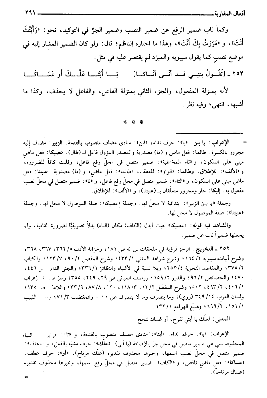 = الإعراب: يا بن: "يا": حرف نداء، "ابن": منادى مضاف منصوب بالفتحة. الزبير: مضاف إليه مجرور بالكسرة. طالما:" فعل ماض و"ما" مصدرية والمصدر المؤول فاعل لـ"طال". عصيكا: فعل ماض مبني على السكون، و"تاء المخاطبة": ضمير متصل في محل رفع فاعل، وقلت كافا للضرورة، و"الألف": للإطلاق. وطالما: "الواو": للعطف، "طالما": فعل ماض، و"ما" مصدرية. عنيتنا: فعل ماض مبني على السكون، و"التاء": ضمير متصل في محل رفع فاعل، و"نا": ضمير متصل في محل نصب مفعول به. إليكا: جار ومجرور متعلقان بـ"عنيتنا"، و"الألف": للإطلاق.