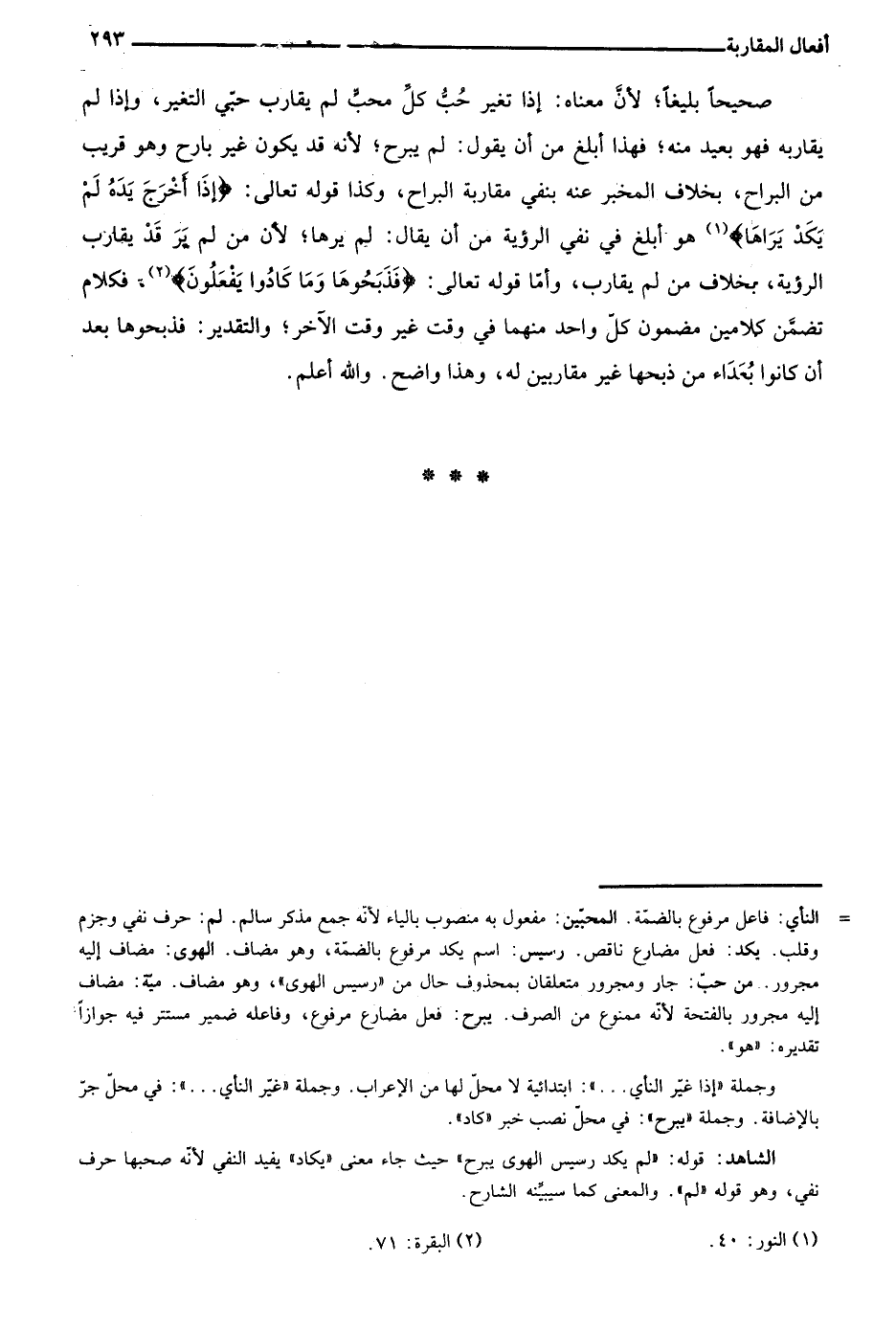 صحيحا بليغا؛ لأن معناه: إذا تغير حب كل محب لم يقارب حبي التغير، وإذا لم يقاربه فهو بعيد منه؛ فهذا أبلغ من أن يقول: لم يبرح؛ لأنه قد يكون غير بارح وهو قريب من البراح، بخلاف المخبر عنه بنفي مقاربة البراح، وكذا قوله تعالى: {إِذَا أَخْرَجَ يَدَهُ لَمْ يَكَدْ يَرَاهَا} 1 هو أبلغ في نفي الرؤية من أن يقال: لم يرها؛ لأن من لم ير قد يقارب الرؤية، بخلاف من لم يقارب، وأما قوله تعالى: {فَذَبَحُوهَا وَمَا كَادُوا يَفْعَلُونَ} 2، فكلام تضمن كلامين مضمون كل واحد منهما في وقت غير وقت الآخر؛ والتقدير: فذبحوها بعد أن كانوا بعداء من ذبحها غير مقاربين له، وهذا واضح. والله أعلم.