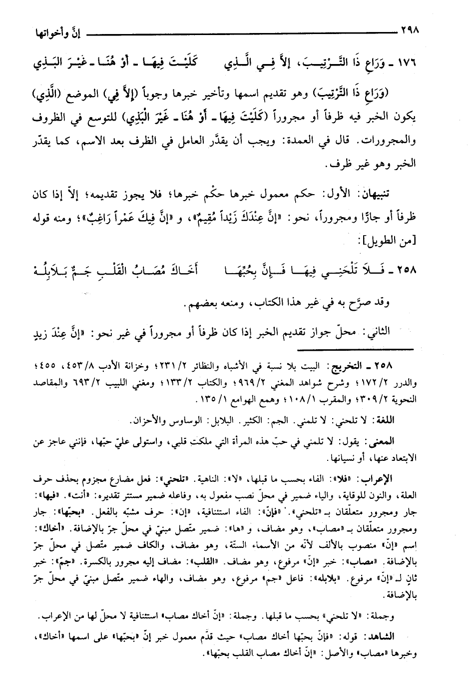 "وَرَاعِ ذَا التَّرْتِيْبَ" وهو تقديم اسمها وتأخير خبرها وجوبا "إلاِّ فِي" الموضع "الَّذِي" يكون الخبر فيه ظرفا أو مجرورا "كَلَيْتَ فِيْهَا -أَوْ هُنَا- غَيْرَ البَذِي" للتوسع في الظروف والمجرورات. قال في العمدة: ويجب أن يقدر العامل في الظرف بعد الاسم، كما يقدر الخبر وهو غير ظرف.