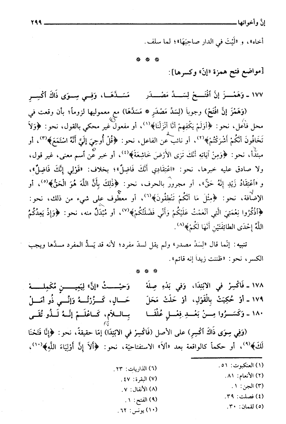 "وَفِي سِوَى ذاكَ اكْسِرِ" على الأصل "فَاكْسِرْ فِي الابْتِدَا" أما حقيقة، نحو: {إِنَّا فَتَحْنَا لَكَ} 9، أو حكما كالواقعة بعد ألا الاستفتاحية نحو: {أَلا إِنَّ أَوْلِيَاءَ اللَّهِ} 10،
