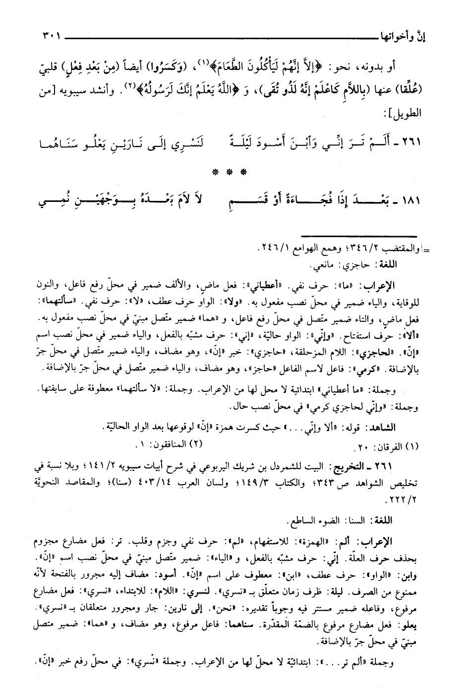الإعراب: ألم: "الهمزة": للاستفهام، "لم": حرف نفي وجزم وقلب. تر: فعل مضارع مجزوم بحذف حرف العلة. إني: حرف مشبه بالفعل، و"الياء": ضمير متصل مبني في محل نصب اسم "إن". وابن: "الواو": حرف عطف، "ابن": معطوف على اسم "إن". أسود: مضاف إليه مجرور بالفتحة لأنه ممنوع من الصرف. ليلة: ظرف زمان متعلق بـ"نسري". لنسري: "اللام": للابتداء، "نسري": فعل مضارع مرفوع، وفاعله ضمير مستتر فيه وجوبا تقديره: "نحن". إلى نارين: جار ومجرور متعلقان بـ"نسري". يعلو: فعل مضارع مرفوع بالضمة المقدرة. سناهما: فاعل مرفوع، وهو مضاف، و"هما": ضمير متصل مبني في محل جر بالإضافة.