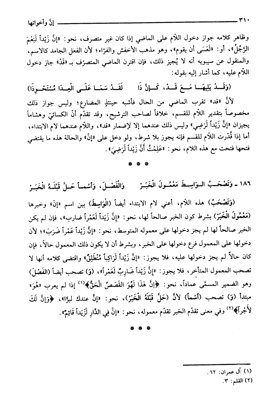 لأن "قد" تقرب الماضي من الحال فأشبه حينئذٍ المضارع؛ وليس جواز ذلك مخصوصا بتقدير اللام للقسم، خلافا لصاحب الترشيح، وقد تقدم أن الكسائي وهشاما يجيزان "إن زيدا لرضي" وليس ذلك عندهما إلا لإضمار "قد"، واللام عندهما لام الابتداء، أما إذا قدرت اللام للقسم فإنه يجوز بلا شرط، ولو دخل على "إن" والحالة هذه ما يقتضي فتحها فتحت مع هذه اللام، نحو: علمت أن زيدا لرضي.