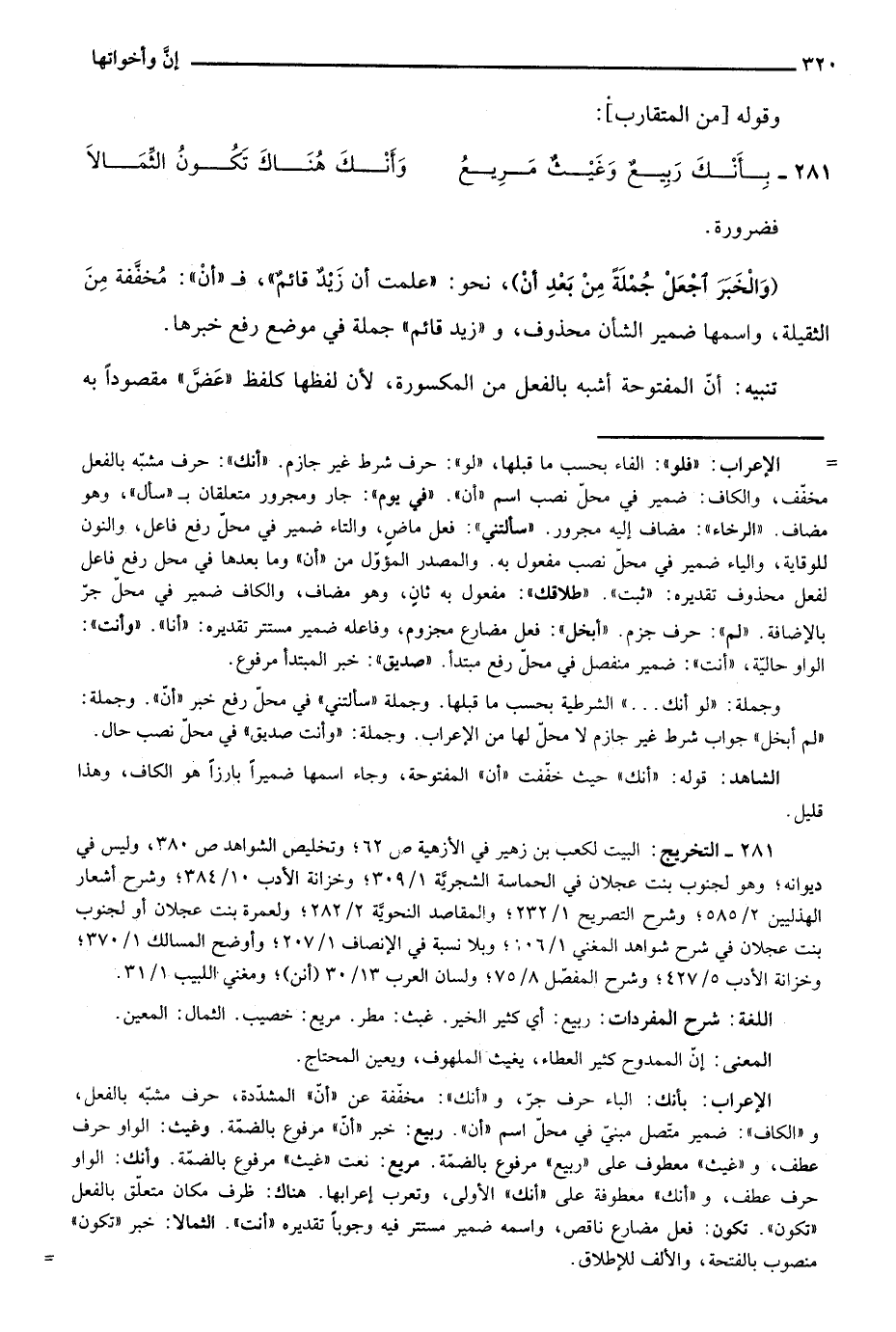 281- التخريج: البيت لكعب بن زهير في الأزهية ص62؛ وتخليص الشواهد ص380، وليس في ديوانه؛ وهو لجنوب بنت عجلان في الحماسة الشجرية 1/ 309؛ وخزانة الأدب 10/ 384؛ وشرح أشعار الهذليين 2/ 585؛ وشرح التصريح 1/ 232؛ والمقاصد النحوية 2/ 282؛ ولعمرة بنت عجلان أو لجنوب بنت عجلان في شرح شواهد المغني 1/ 106؛ وبلا نسبة في الإنصاف 1/ 207؛ وأوضح المسالك 1/ 370؛ وخزانة الأدب 5/ 427؛ وشرح المفصل 8/ 75؛ ولسان العرب 13/ 30 "أنن"؛ ومغني اللبيب 1/ 31.