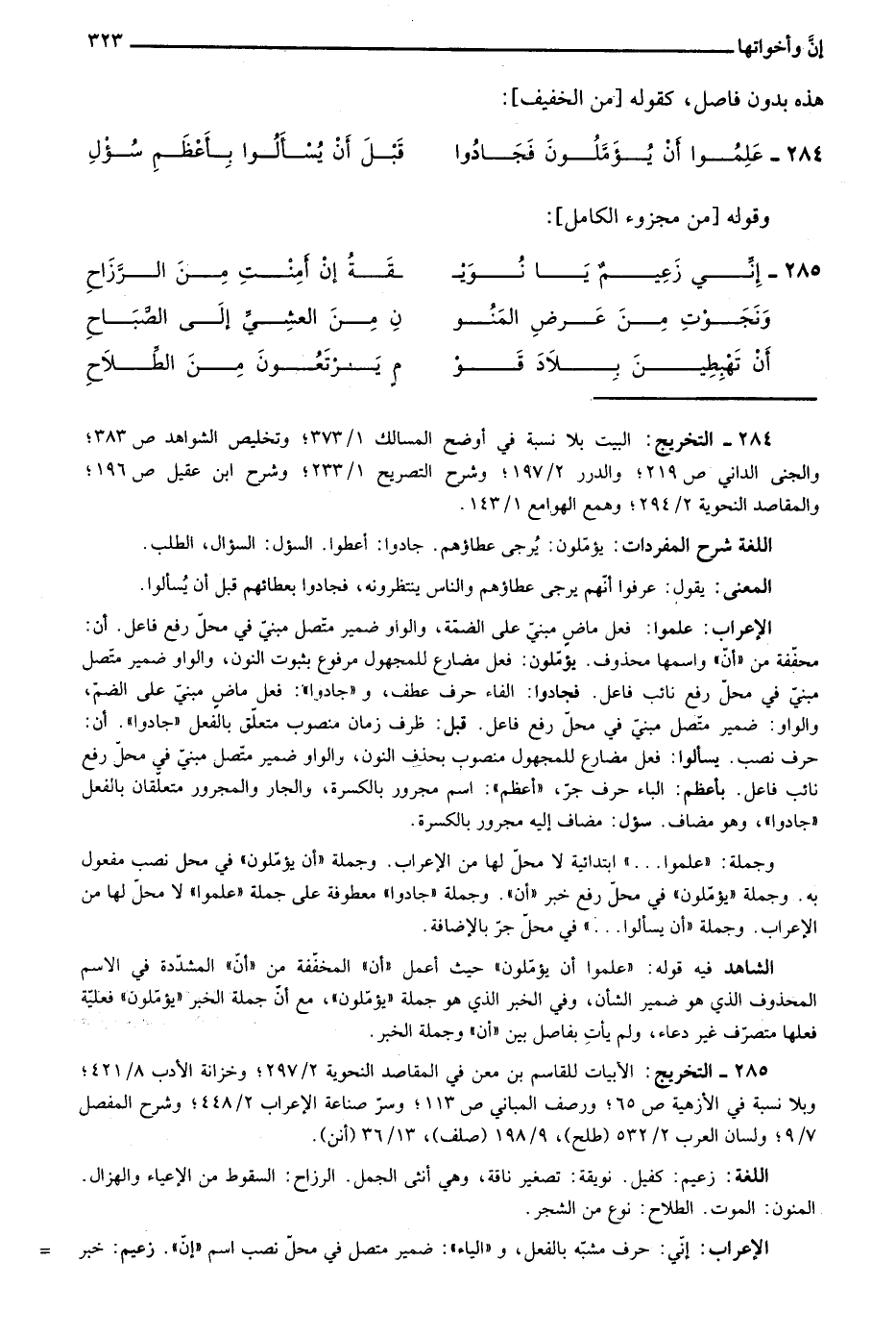 285- التخريج: الأبيات للقاسم بن معن في المقاصد النحوية 2/ 297؛ وخزانة الأدب 8/ 421؛ وبلا نسبة في الأزهية ص65؛ ورصف المباني ص113؛ وسر صناعة الإعراب 2/ 448؛ وشرح المفصل 7/ 9؛ ولسان العرب 2/ 532 "طلح"، 9/ 198 "صلف"، 13/ 36 "أنن".