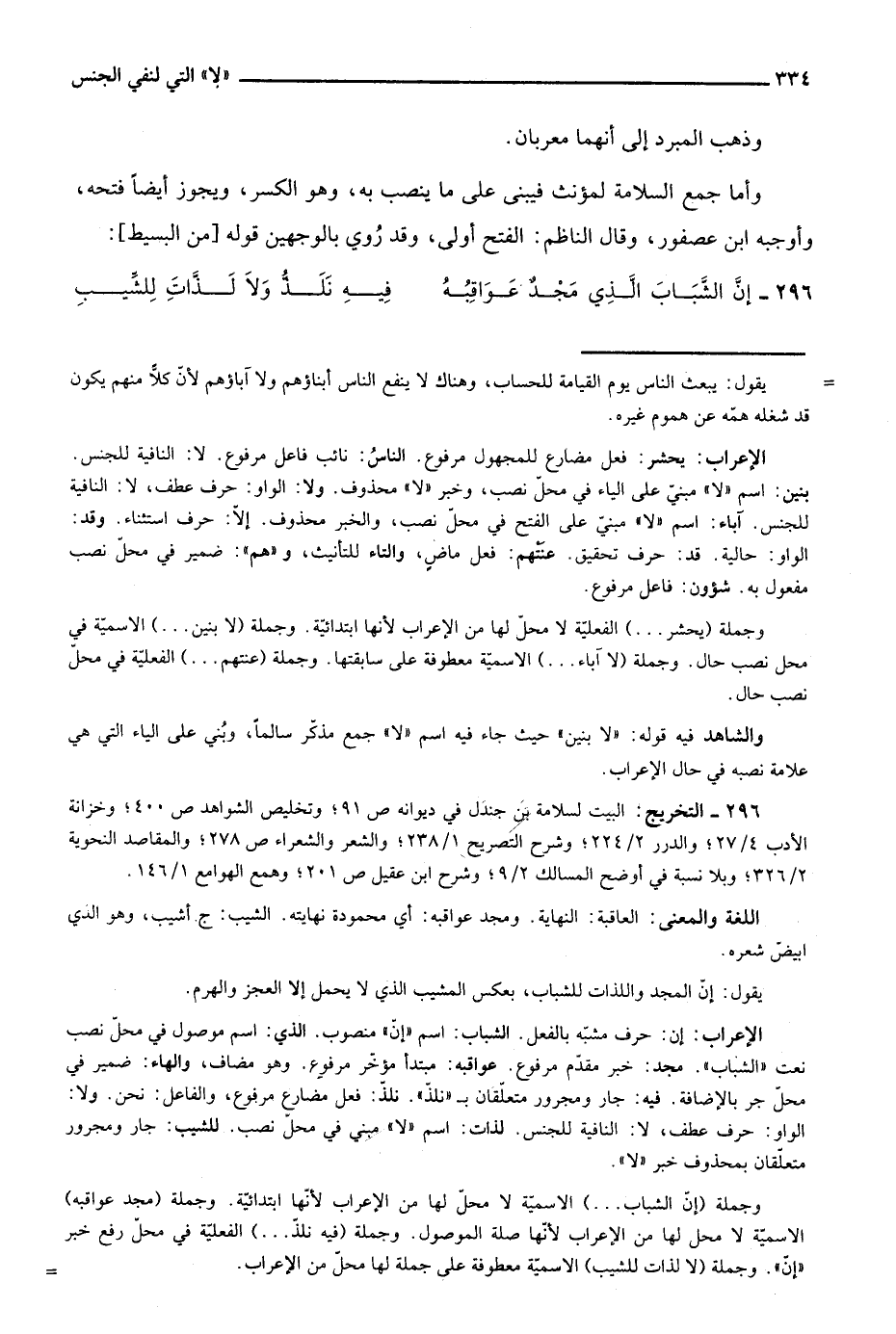 الإعراب: إن: حرف مشبه بالفعل. الشباب: اسم "إن" منصوب. الذي: اسم موصول في محل نصب نعت "الشباب". مجد: خبر مقدم مرفوع. عواقبه: مبتدأ مؤخر مرفوع. وهو مضاف، والهاء: ضمير في محل جر بالإضافة. فيه: جار ومجرور متعلقان بـ"نلذ". فعل مضارع مرفوع، والفاعل: نحن. ولا: الواو: حرف عطف، لا: النافية للجنس. لذات: اسم "لا" مبني في محل نصب. للشيب: جار ومجرور متعلقان بمحذوف خبر "لا".