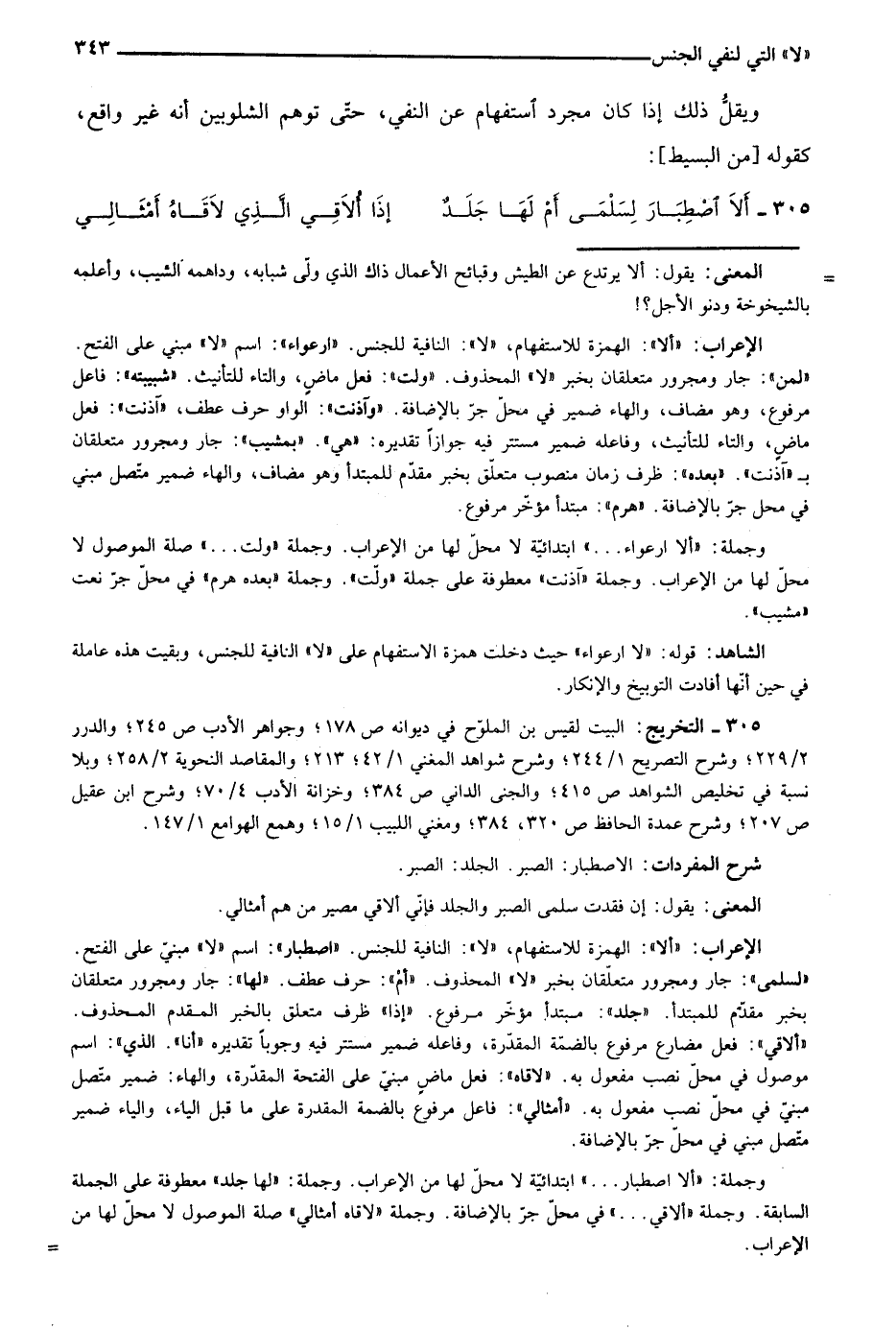 الإعراب: "ألا": الهمزة للاستفهام، "لا": النافية للجنس. "اصطبار": اسم "لا" مبني على الفتح. "لسلمى": جار ومجرور متعلقان بخبر "لا" المحذوف. "أم": حرف عطف. "لها": جار ومجرور متعلقان بخبر مقدم للمبتدأ. "جلد": مبتدأ مؤخر مرفوع. "إذا" ظرف متعلق بالخبر المقدم المحذوف. "ألاقي": فعل مضارع مرفوع بالضمة المقدرة، وفاعله ضمير مستتر فيه وجوبا تقديره "أنا". الذي: اسم موصول في محل نصب مفعول به. "لاقاه": فعل ماض مبني على الفتحة المقدرة، والهاء: ضمير متصل مبني في محل نصب مفعول به. "أمثالي": فاعل مرفوع بالضمة المقدرة على ما قبل الياء، والياء ضمير متصل مبني في محل جر بالإضافة.