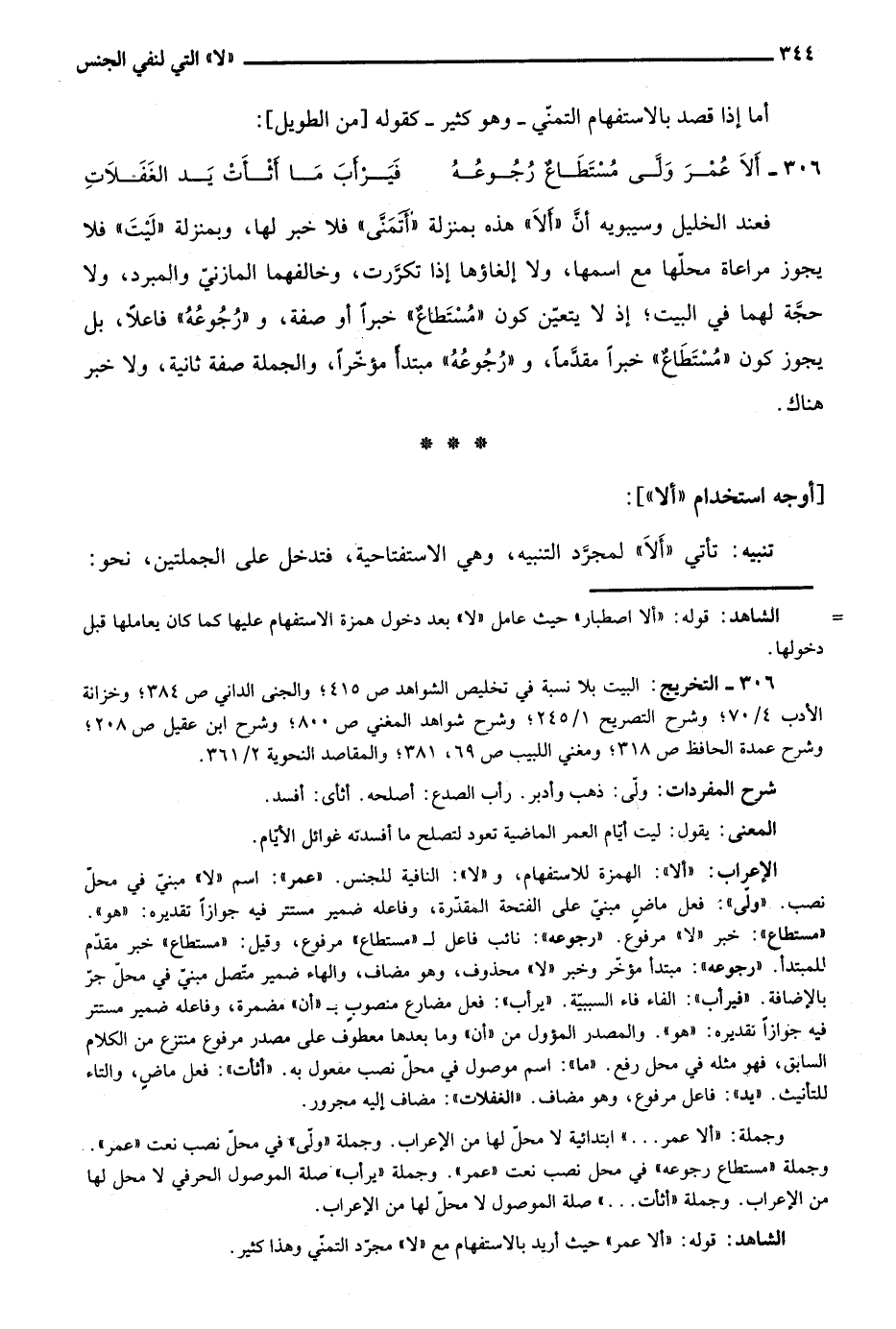 فعند الخليل وسيبويه أن "ألا" هذه بمنزلة "أتمنى" فلا خبر لها، وبمنزلة "ليت" فلا يجوز مراعاة محلها مع اسمها، ولا إلغاؤها إذا تكررت، وخالفهما المازني والمبرد، ولا حجة لهما في البيت؛ إذ لا يتعين كون "مستطاع" خبر أو صفة، و"رجوعه" فاعلا، بل يجوز كون "مستطاع" خبر مقدما، و"رجوعه" مبتدأ مؤخرا، والجملة صفة ثانية، ولا خبر هناك.
